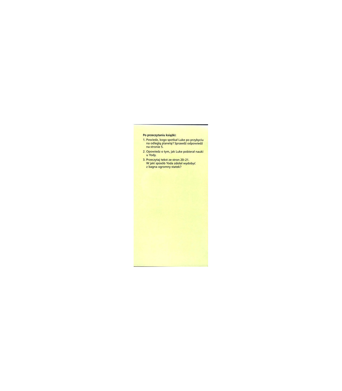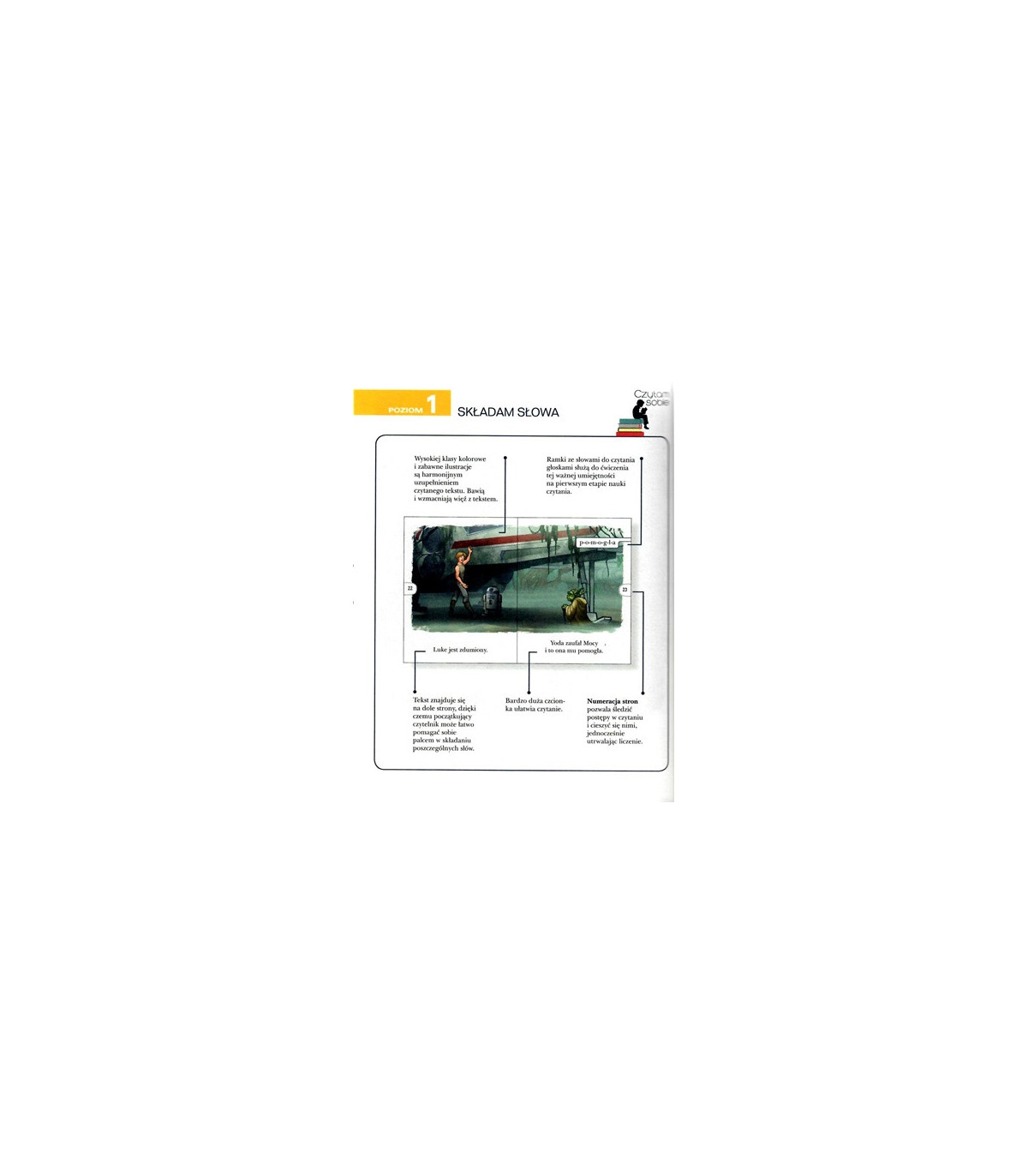 Droga mocy. Czytam sobie ( poziom pierwszy) to prosta i wciągająca historia ze świata Star Wars, która zachęci twoje dziecko do nauki samodzielnego czytania. W końcu kto nie chciałby poczytać o Luke'u Skywalkerze i jego pierwszym spotkaniu z Yodą? Pokaż dziecku jasną stronę mocy oraz moc czytania!