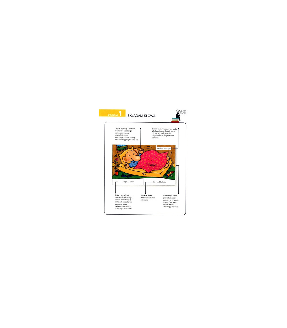 Czytam sobie to trójpoziomowy program wspierający naukę czytania, przeznaczony dla dzieci w wieku 5-7 lat. Książki na poziomie pierwszym napisane są krótkimi zdaniami, przy użyciu 23 podstawowych głosek języka polskiego. Bardzo duża czcionka ułatwia czytanie, a dzięki zamieszczonym obok tekstu ramkom rodzice będą mogli ćwiczyć z dzieckiem głoskowanie. Każde zdanie pokazane jest również w formie graficznej na dużych kolorowych ilustracjach, co wspiera rozumienie tekstu i zachęca do pracy z książką. Forma książek w serii Czytam sobie jest zgodna z zaleceniami metodyków.
