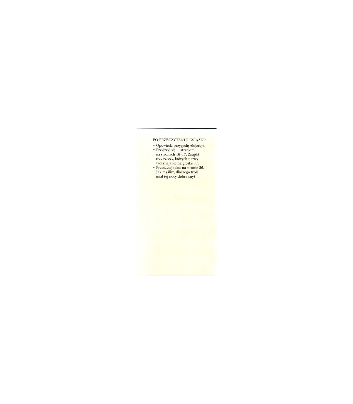 Koc trolla Alojzego. Czytam sobie, poziom pierwszy - Składam słowa, to doskonały wybór na dobry początek czytania. Prostą, ale zabawną historię stworzyła Zofia Stanecka, autorka bestsellerowej, uwielbianej przez rodziców i dzieci serii książek o Basi. Dowcipne ilustracje stworzyła znana rysowniczka Jona Jung. Historia opowiada o trollu Alojzym, który w prezencie od kuzyna dostał cieplutki i miły kocyk. Okrycie bardzo przypadło mu do gustu.