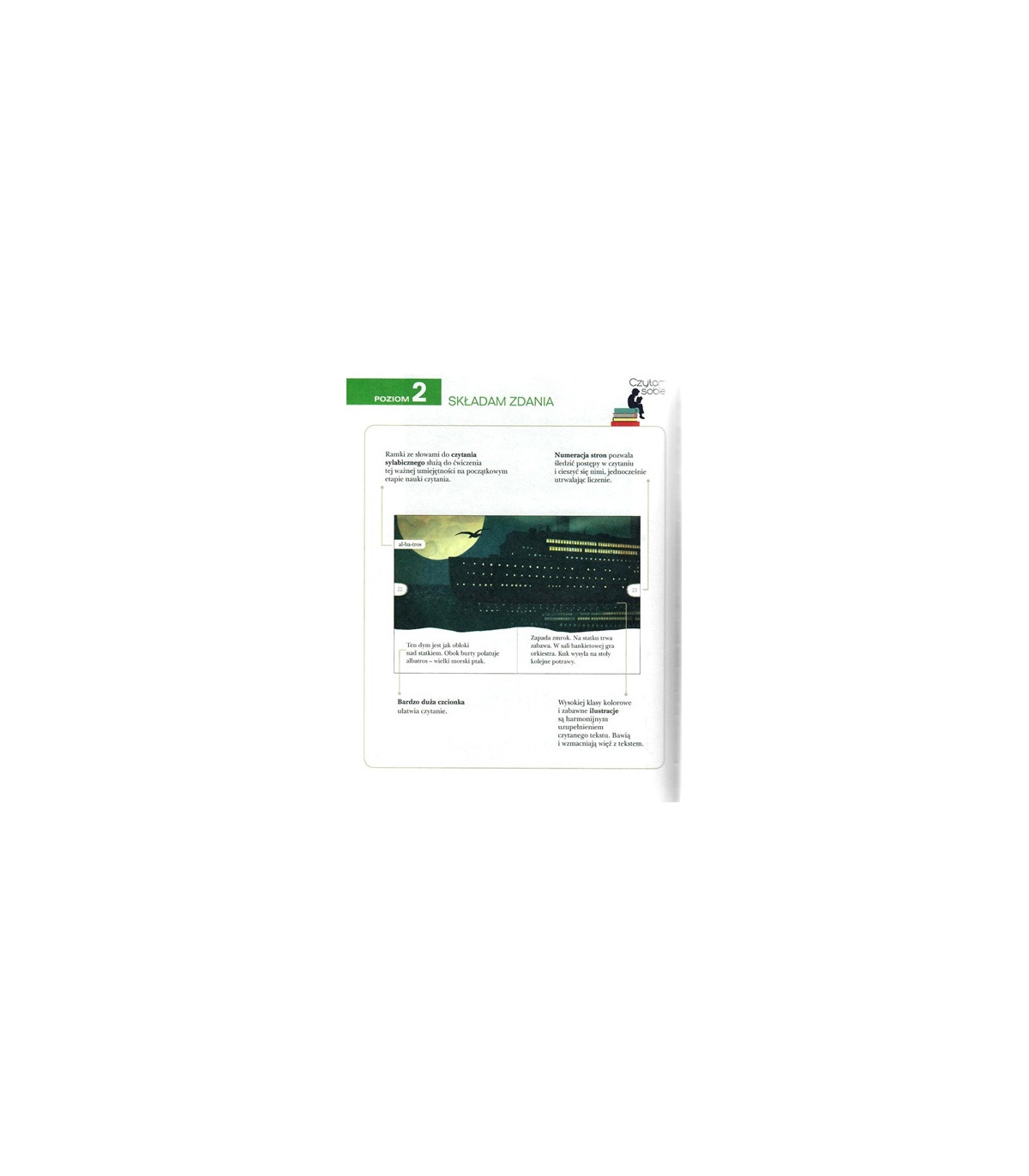 Składam zdania, drugi poziom serii Czytam sobie, to doskonała propozycja dla dzieci, które postawiły już pierwsze kroki w nauce czytania. Opowiadania napisane są dłuższymi, często złożonymi zdaniami oraz zawierają elementy dialogu. Bardzo duża czcionka ułatwia czytanie, a zamieszczone po bokach stron ramki służą do ćwiczenia sylabizowania. Teksty na tym poziomie składają się z 800-900 wyrazów opartych na 23 podstawowych głoskach oraz "h". Forma książek zgodna jest z zaleceniami metodyków.