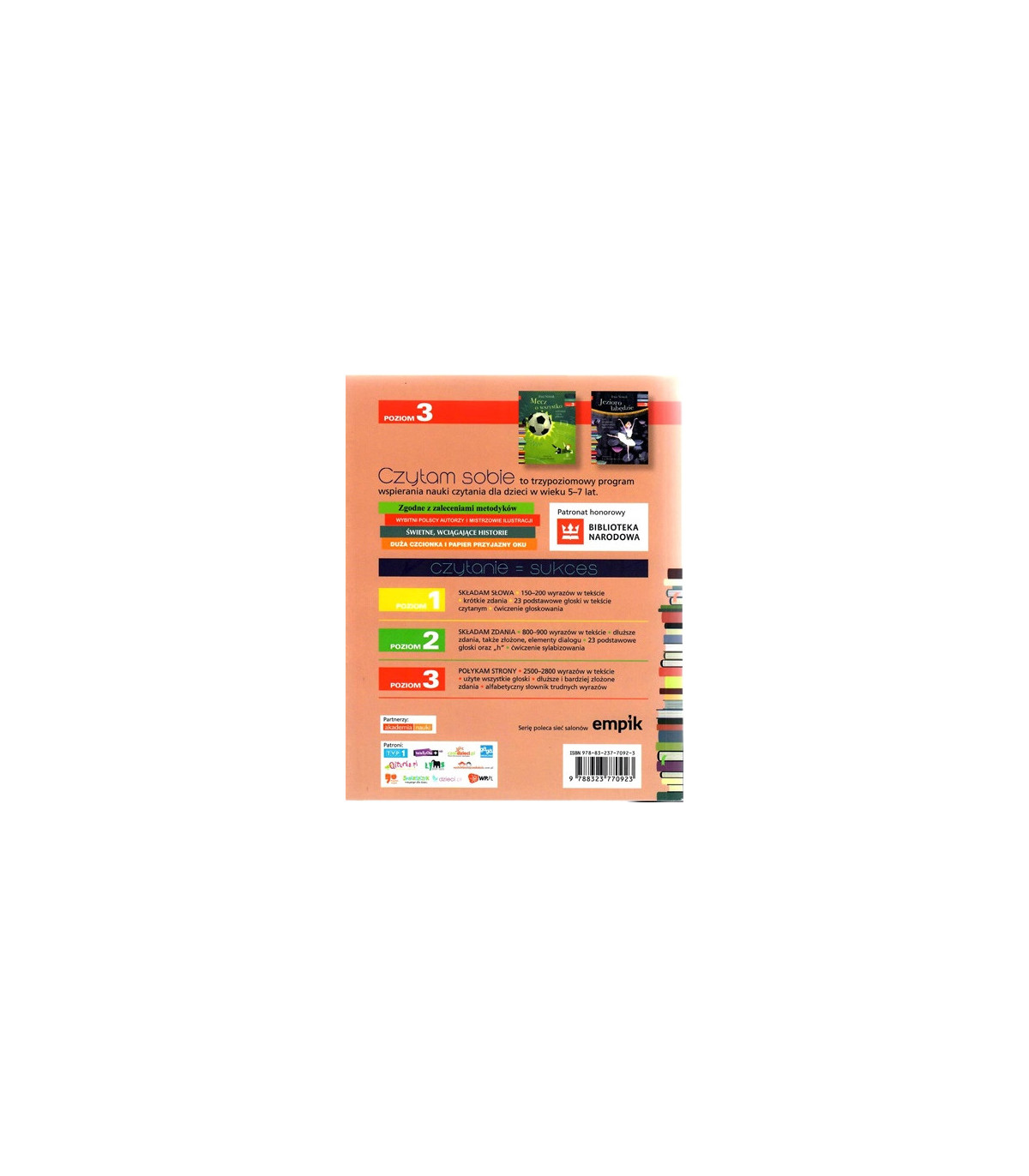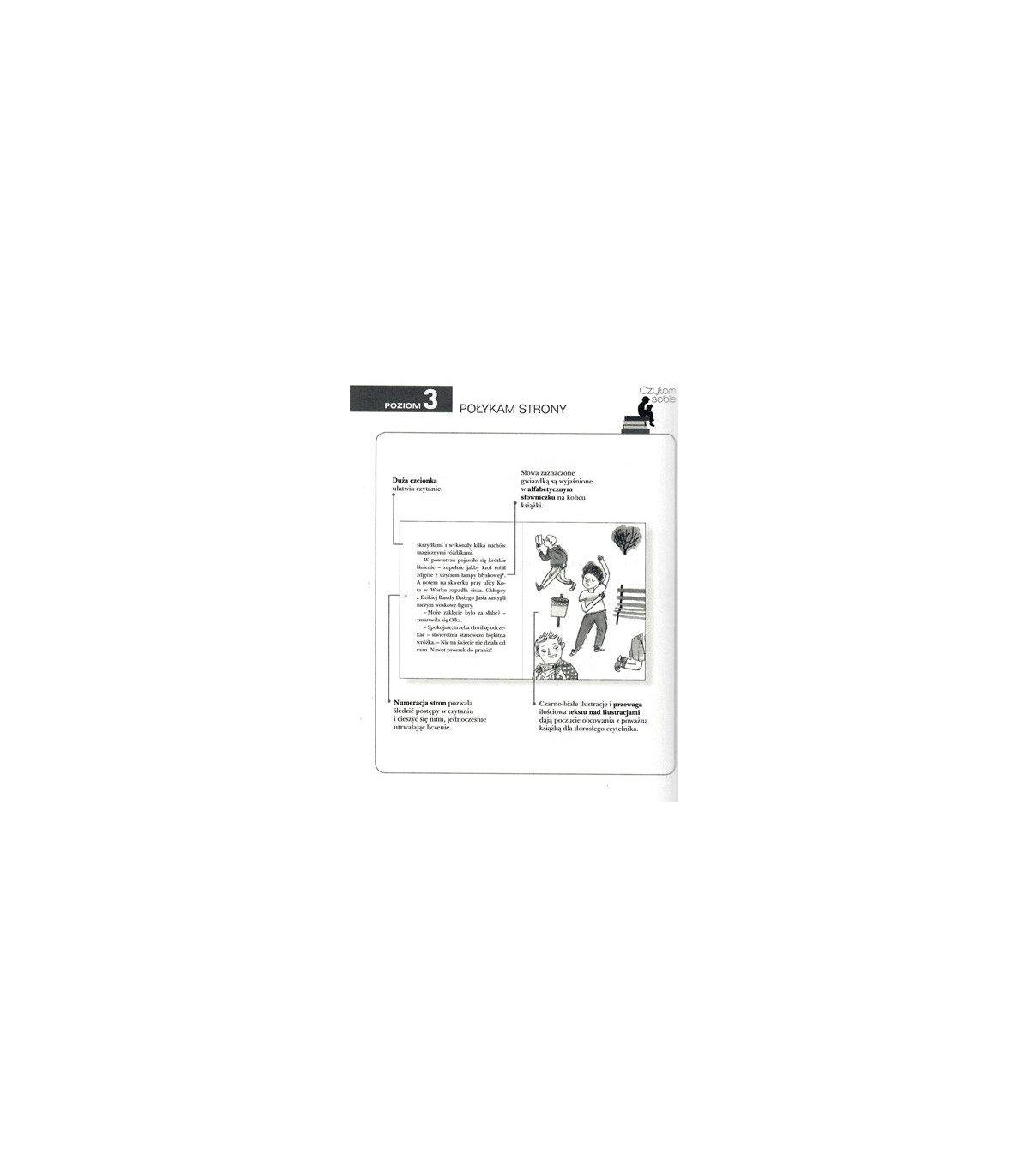 Poziom trzeci wspomagającej naukę czytania serii Czytam sobie to emocjonujące historie napisane dłuższymi, bardziej złożonymi zdaniami. Trudniejsze słowa oznaczono gwiazdką i wyjaśniono w słowniczku pojęć na końcu książki. Teksty złożone są z 2500-2800 wyrazów.