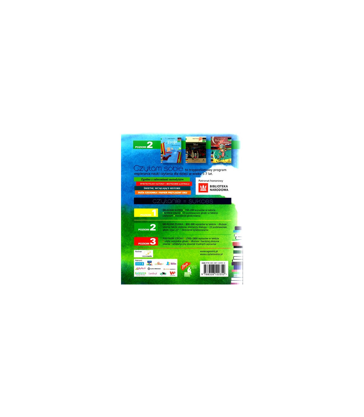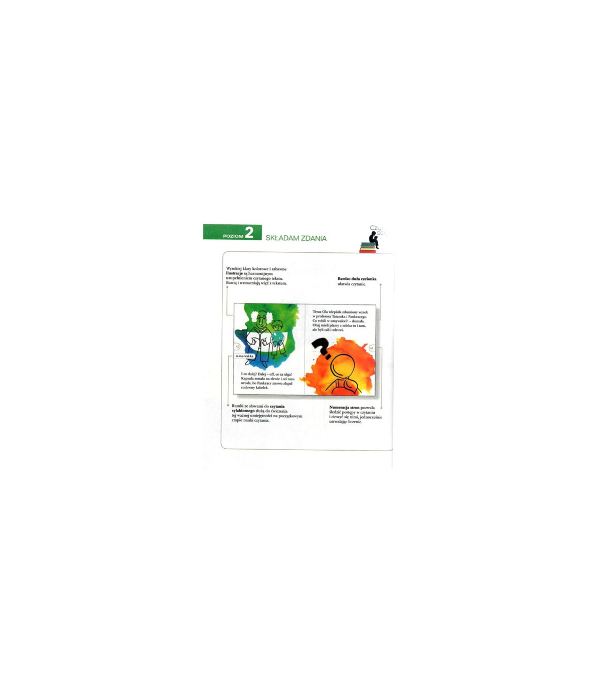 Trzypoziomowa seria Czytam sobie jest skierowana do dzieci, które zaczynają przygodę z samodzielnym czytaniem. Książki na drugim poziomie charakteryzują się krótkimi, prostymi tekstami, w których autorzy posługują się tylko 23 podstawowymi głoskami. Na tym etapie czytania ważna jest umiejętność sylabizowania, którą dzieci mogą ćwiczyć dzięki zamieszczonym w książce ćwiczeniom. Wciągające i pełne emocji historie sprawiają, że spotkanie z książką staje się pasjonującą przygodą. Trud samodzielnej lektury wynagradza dołączony do książki Dyplom sukcesu oraz kolorowe naklejki z bohaterami. A sukces młodego czytelnika jest nie do przecenienia!