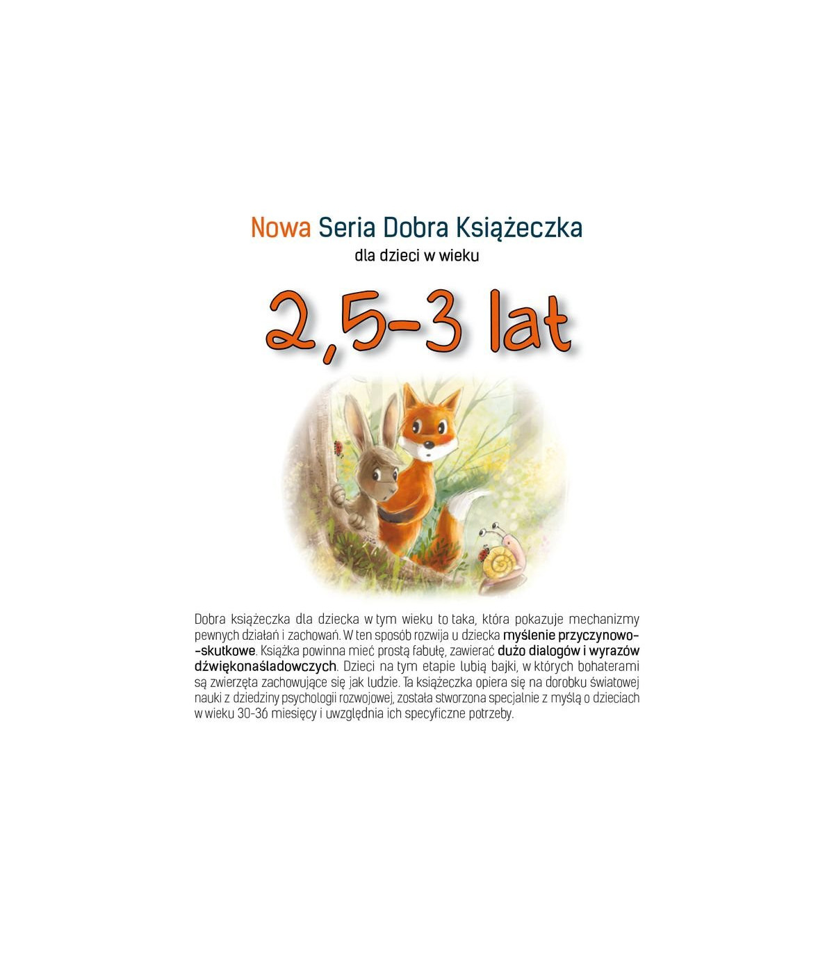 Dzieci na tym etapie lubią bajki, w których bohaterami są zwierzęta zachowujące się jak ludzie. Ta książeczka opiera się na dorobku światowej nauki z dziedziny psychologii rozwojowej, została stworzona specjalnie z myślą o dzieciach w wieku 30-36 miesięcy i uwzględnia ich specyficzne potrzeby.