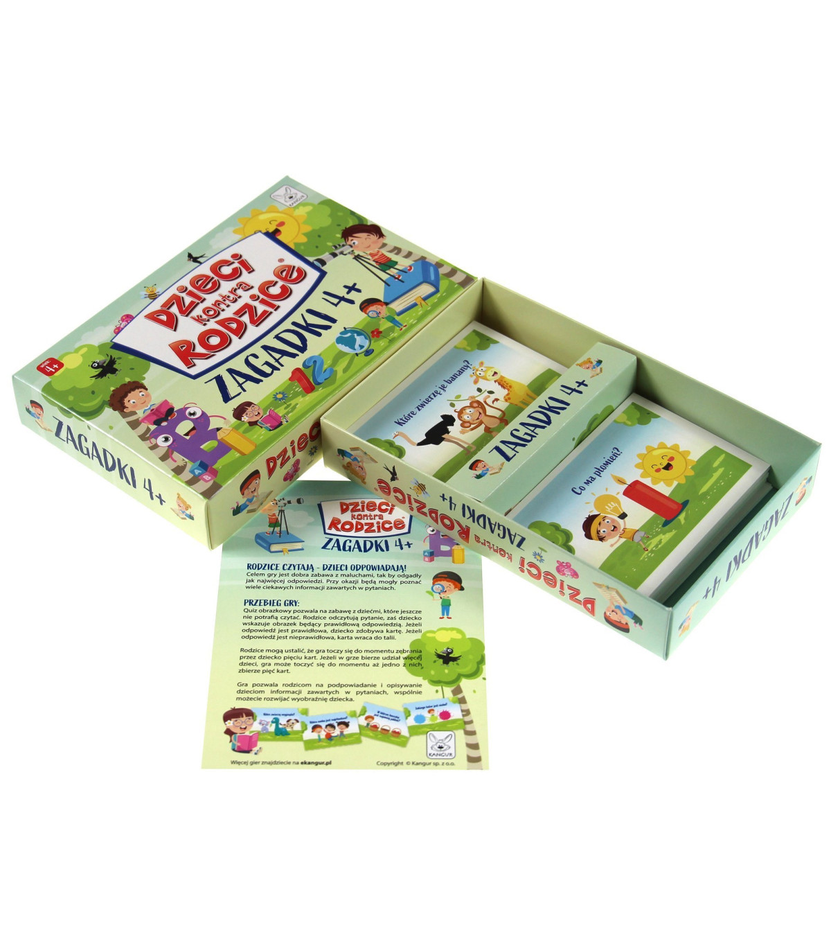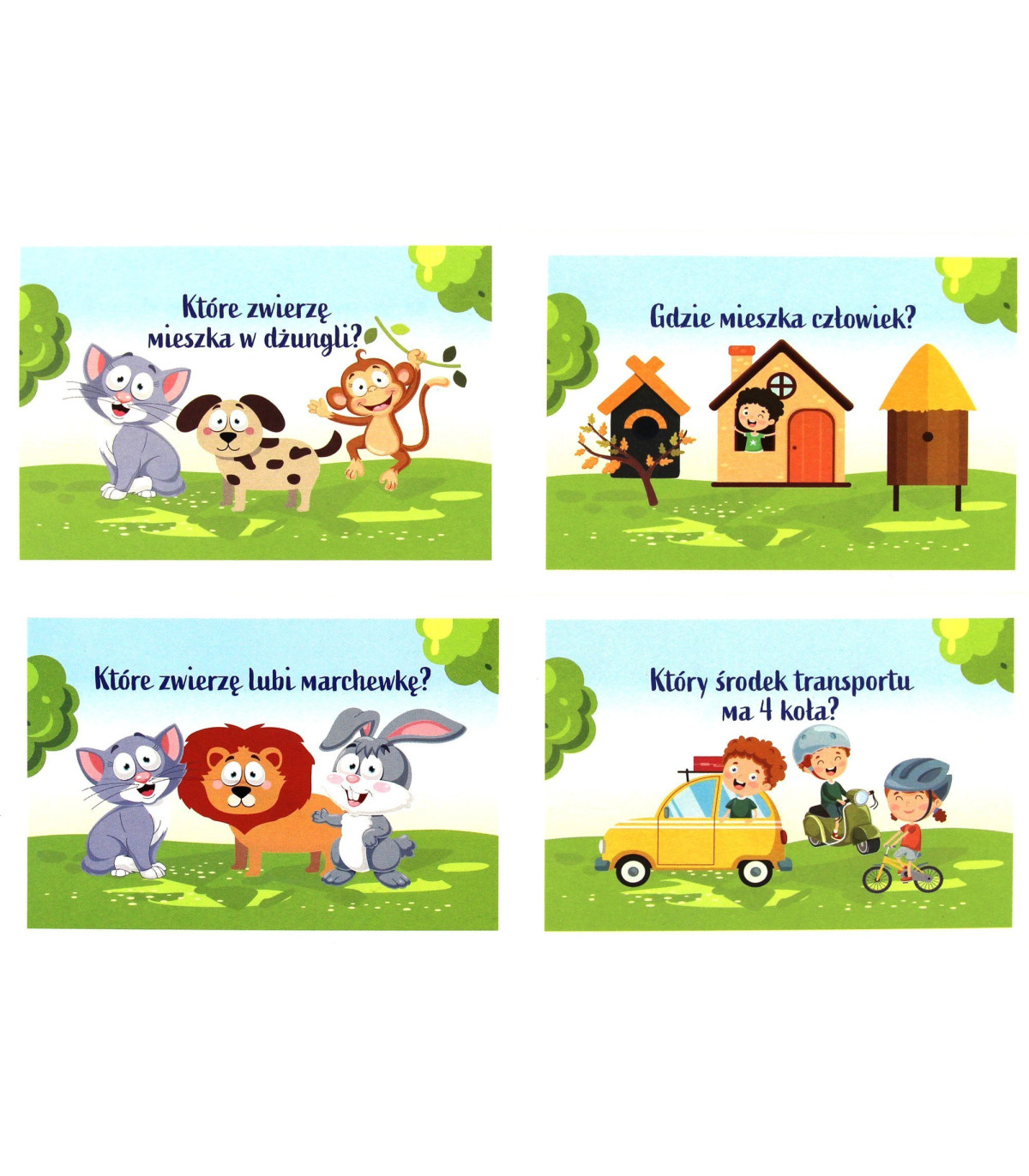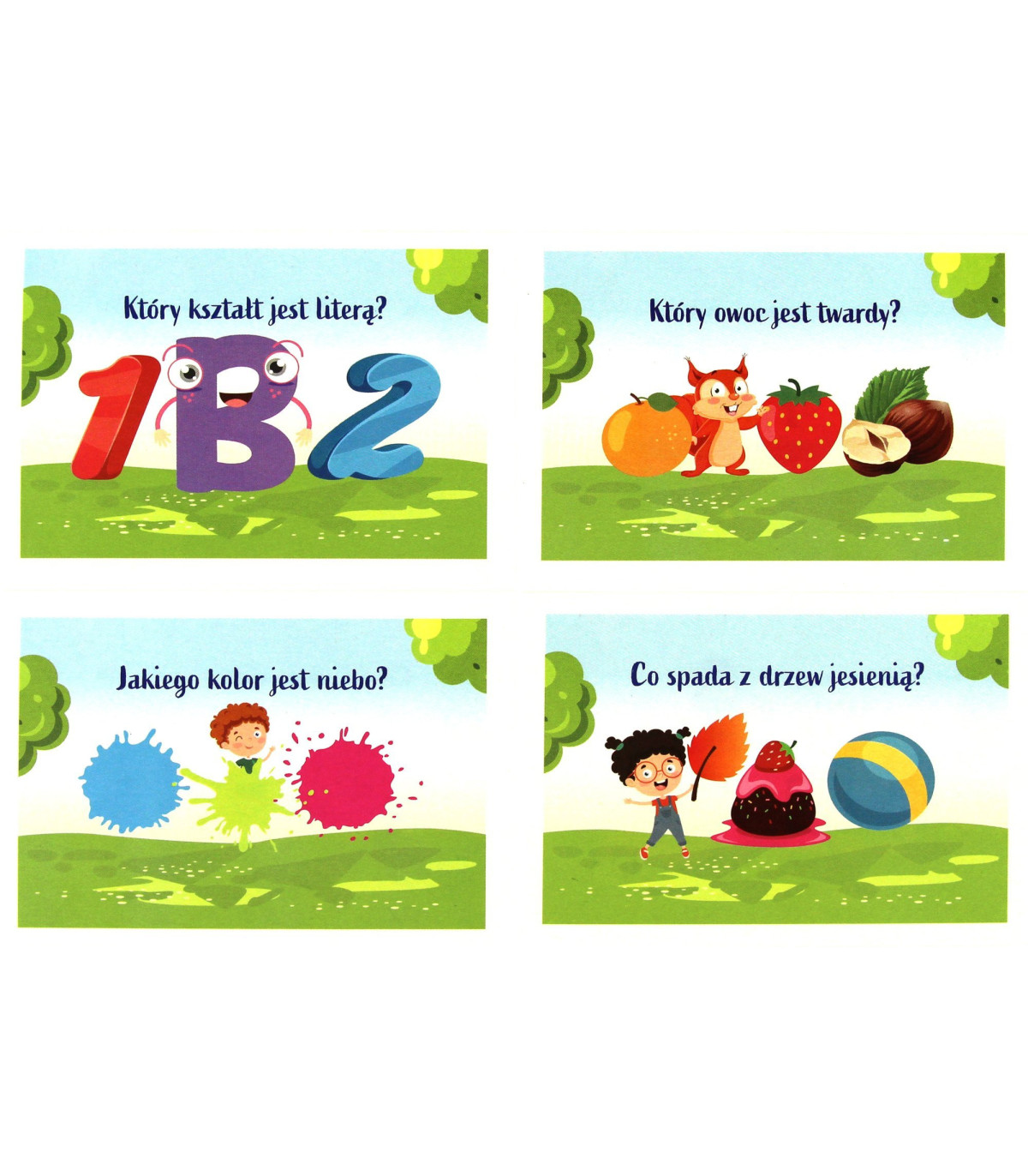 Karty zawierają rysunkowe odpowiedzi na pytania, dlatego dzieci, które jeszcze nie umieją czytać będą się dobrze bawić.
