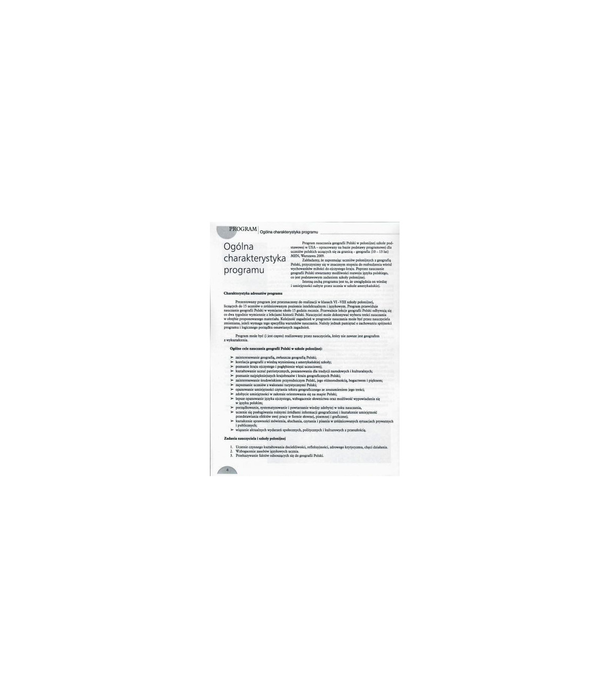 Głównym założeniem autorki jest zapoznanie uczniów polonijnych z geografią Polski i przyczynienie się do rozbudzenia wśród wychowanków miłości do ojczystego kraju. Nauczanie geografii Polski, stwarza możliwość rozwoju języka polskiego, co jest podstawowym zadaniem szkoły polonijnej. Podręczniki przeznaczone są dla klas liczących do 15 uczniów o zróżnicowanym poziomie intelektualnym i językowym. Program przewiduje nauczanie geografii w wymiarze około 15 godzin rocznie.