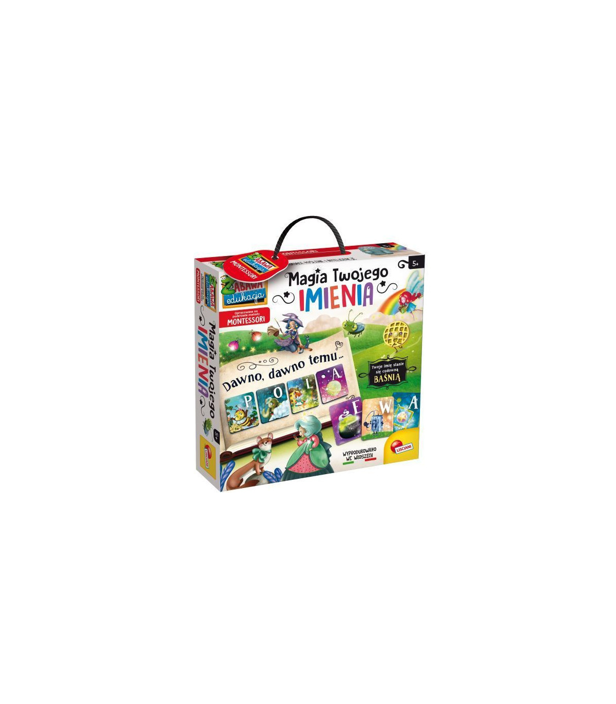 Gra zawiera ponad 100 ilustrowanych kart, a na każdej z nich dziecko znajdzie literę i odpowiadający jej element ze świata baśni i fantazji. Układając swoje imię z kart z literami, dziecko tworzy baśń na podstawie swojego imienia.