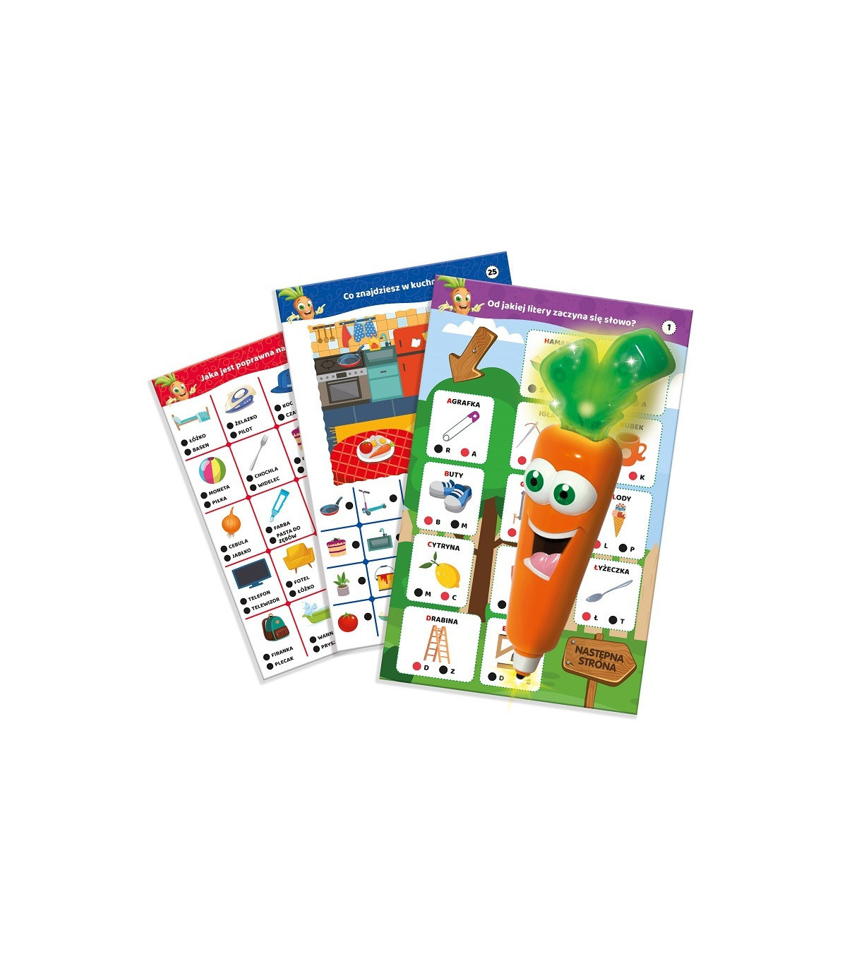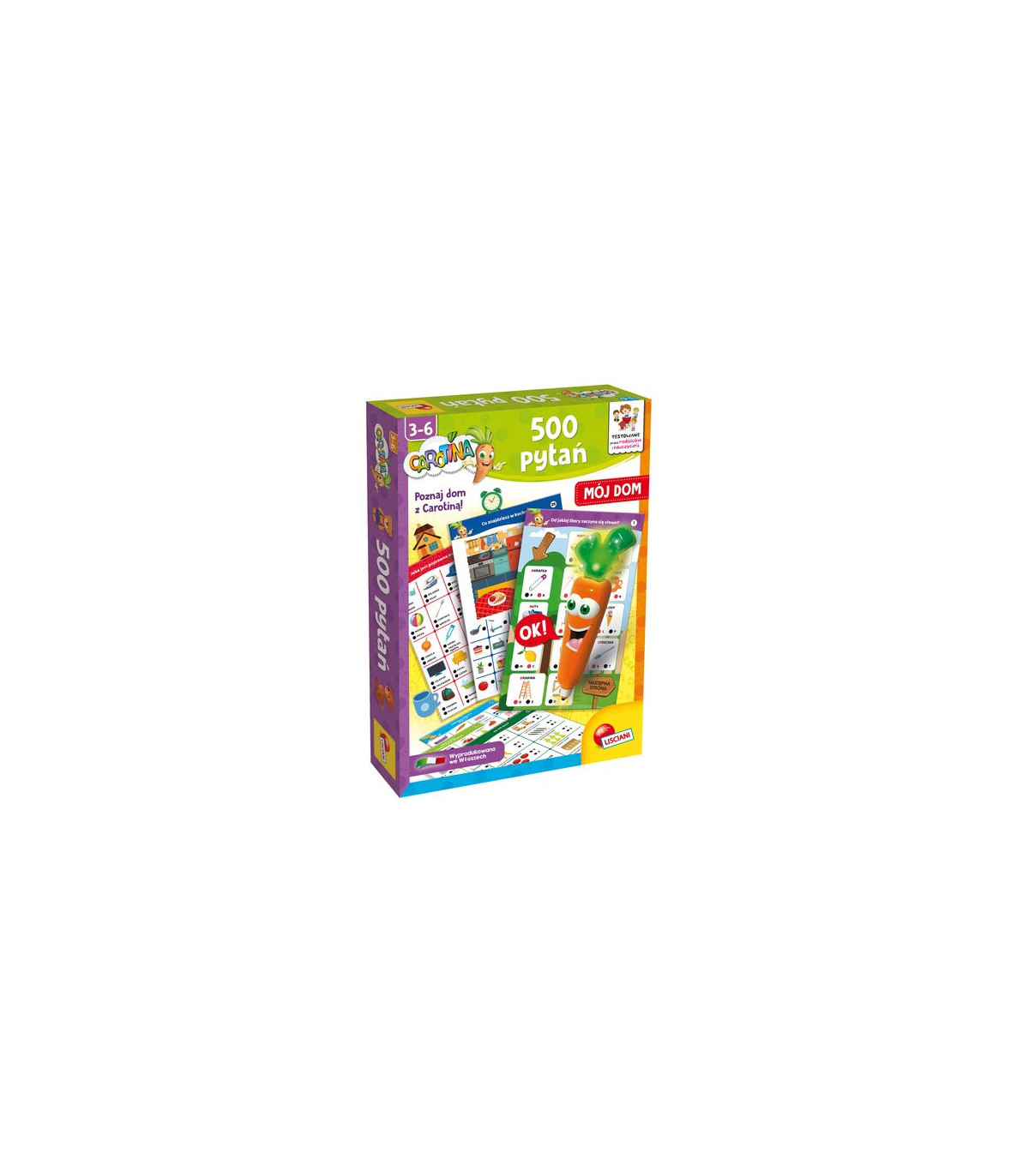Carotina 500 pytań Mój dom to gra edukacyjna, która dzięki 30 interaktywnym kartom dydaktycznym pomoże dziecku w nauce wielu słów związanych z domem i jego otoczeniem. Aby odpowiedzieć, dziecko używa mówiącej i świecącej Carotiny. Wystarczy nacisnąć jej końcówką czarną kropkę znajdującą się przy wybranej odpowiedzi. W przypadku poprawnej, Carotina nagradza dziecko radosnym okrzykiem. W przeciwnym razie, smutnym westchnięciem zmotywuje je do podjęcia kolejnej próby. Dziecko może także zagrać w Szukaj i znajdź, wyszukując przedmioty na ilustracjach.