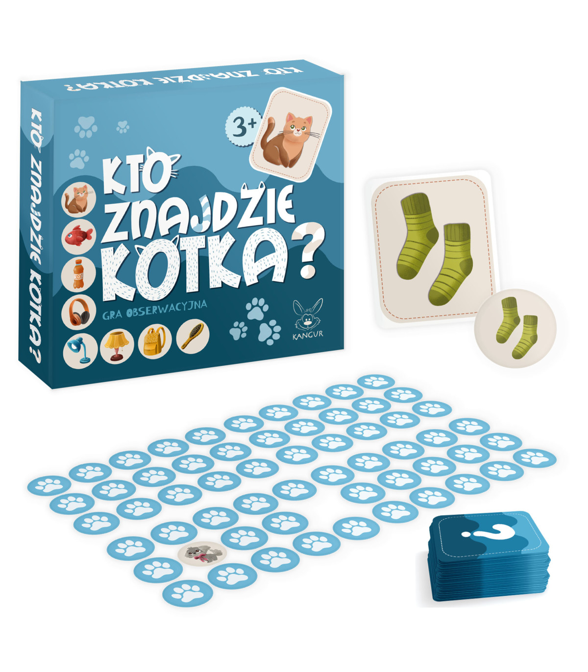 Kto znajdzie kotka? Wesoła zabawa dla najmłodszych! Piękne ilustrowane żetony odpowiadają obrazkom z kart.