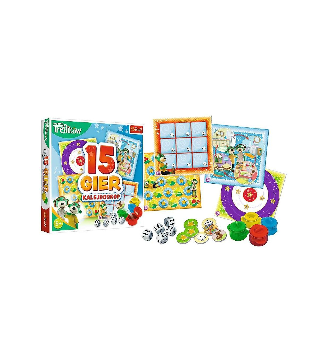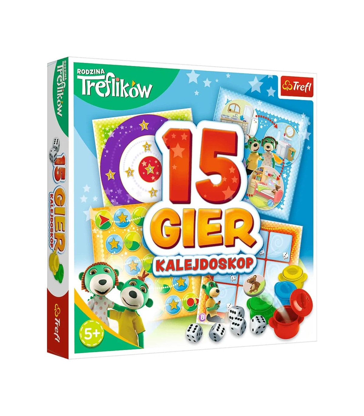 Kalejdoskop 15 gier to zestaw wciągających zabaw dla całej rodziny, wzbogacony oryginalnymi garnuszkami, pełniącymi funkcję pionków.
