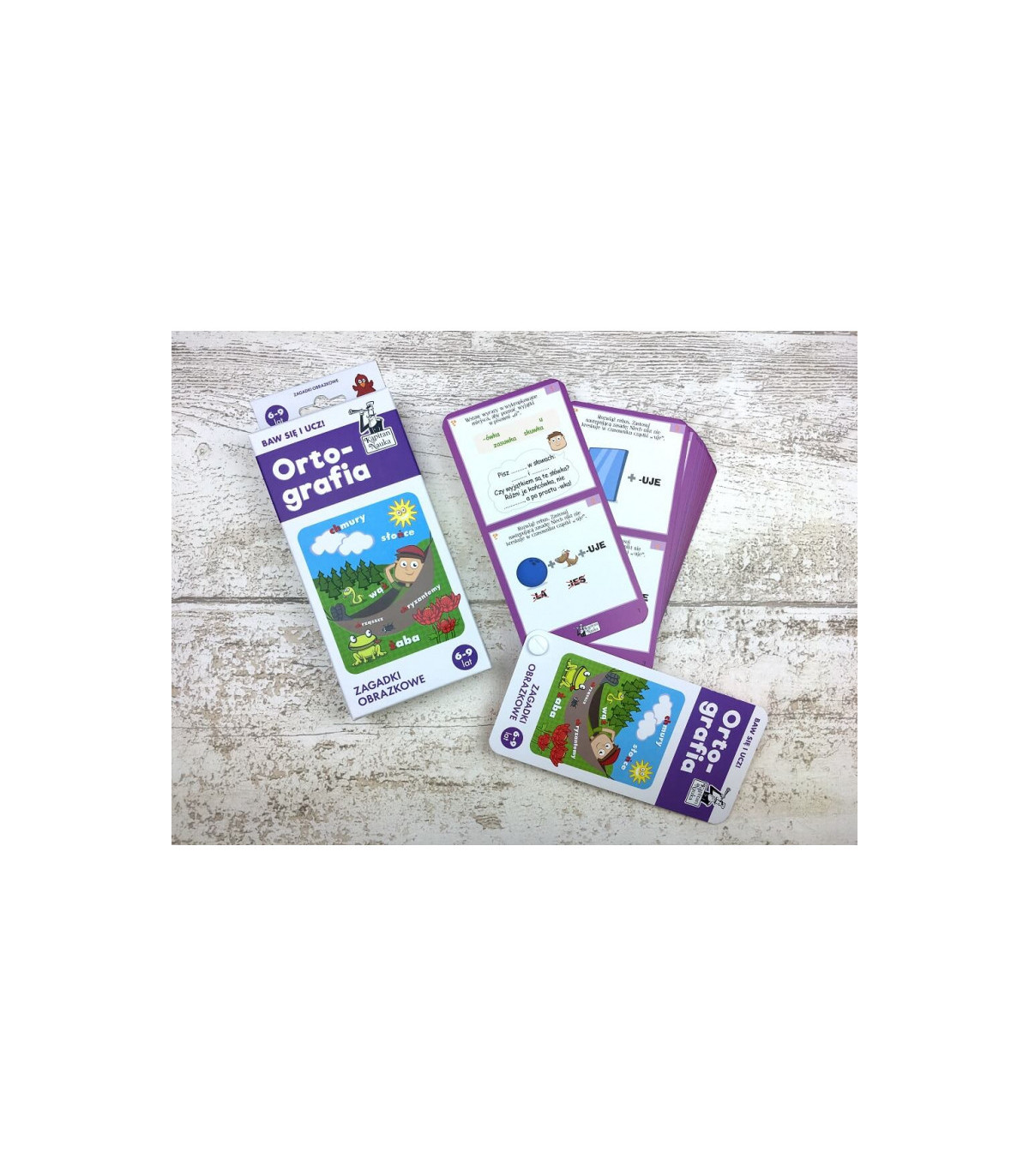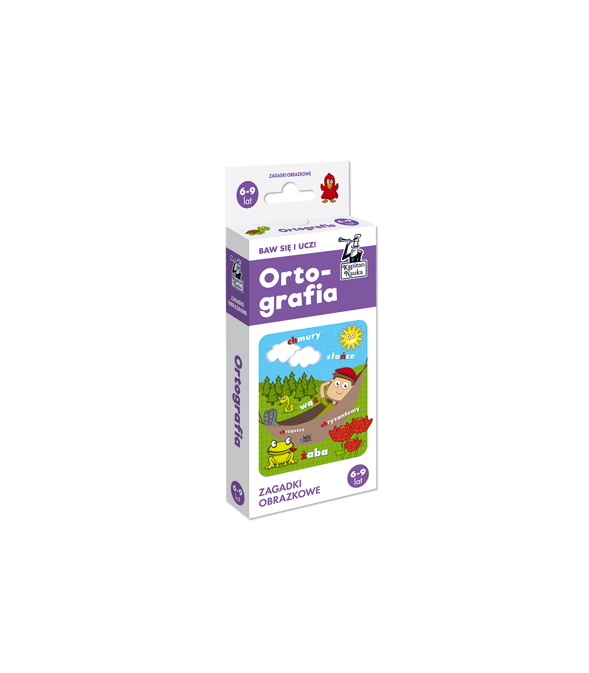 Książeczka Ortografia 6–9 lat. Zagadki obrazkowe zawiera niemal 100 wciągających zabaw o różnym stopniu trudności, polegających na łączeniu wyrazów z ilustracją, uzupełnianiu brakujących liter, odkrywaniu zasady łączącej pisownię wybranych słów czy dobieraniu wyrazów pokrewnych z pisownią wymienną. Dzięki nim uczniowie opanują pisownię wyrazów z u, ó, ż, rz, h oraz ch. Rymowane reguły ortograficzne złożone z wyrazów z tą samą trudną literą ułatwią zapamiętanie najważniejszych zasad pisowni. Na każdej stronie znajdują się dwa zadania, a na odwrocie karty – odpowiedzi.