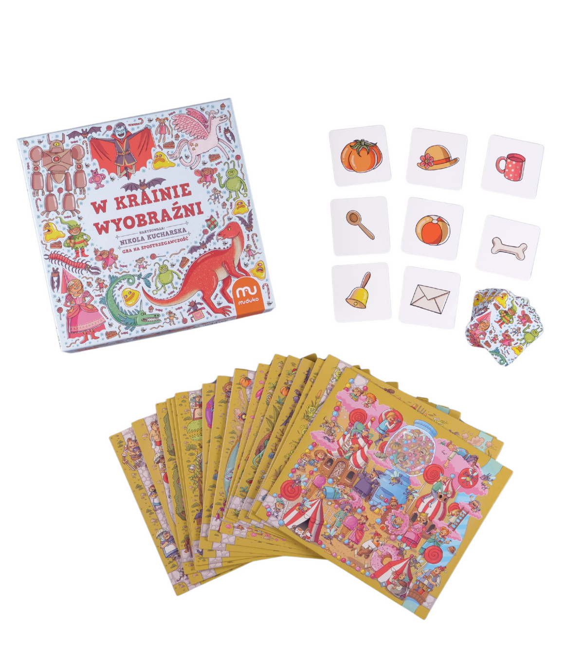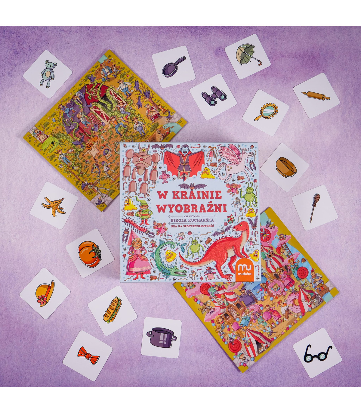 To kultowa już gra na spostrzegawczość! W Krainie Wyobraźni jest bezpośrednią kontynuacją W Krainie Baśni i W Krainie Legend – wszystkie gry można ze sobą łączyć, ale też grać oddzielnie.