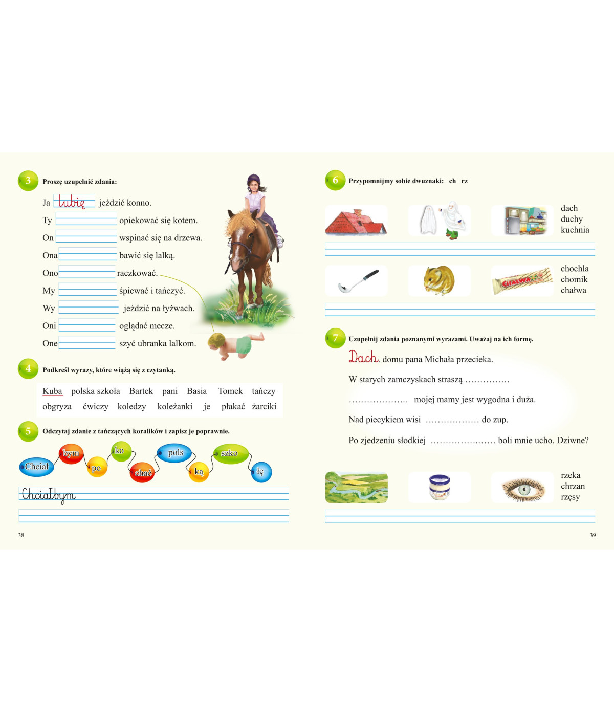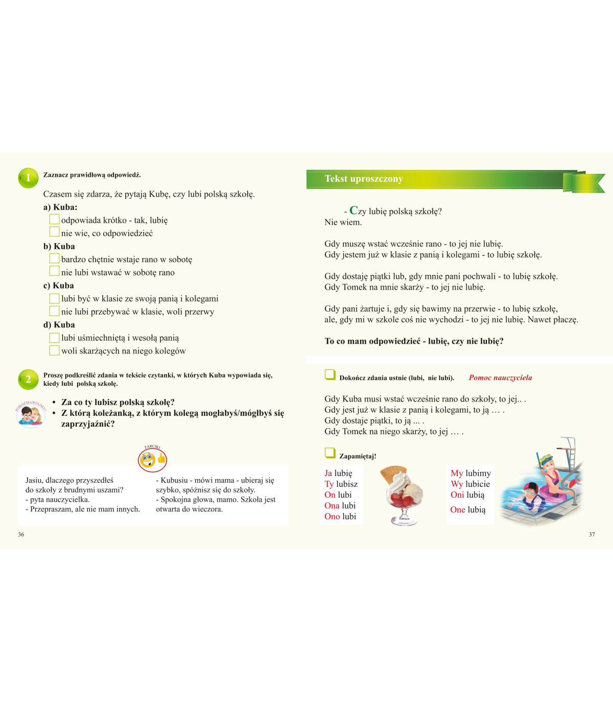 Każdy blok lekcyjny ma podobny układ i daje uczniowi przewidywalność i poczucie bezpieczeństwa. Ćwiczenia i zabawy językowe przewidziane na każdy etap nauki sprawdzają rozumienie tekstów i utrwalają słownictwo. Powtarzają dwuznaki, zmiękczenia, ćwiczenia na sylabach i konsekwentnie ćwiczą budowę zdań. Ich różnorodność dostarcza dzieciom miłej zabawy w szkole i w domu.