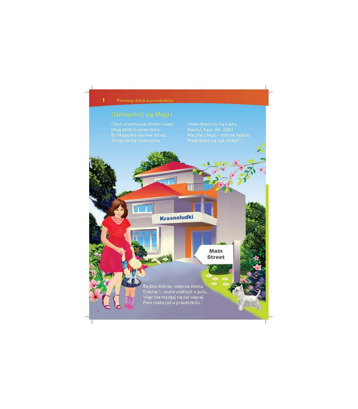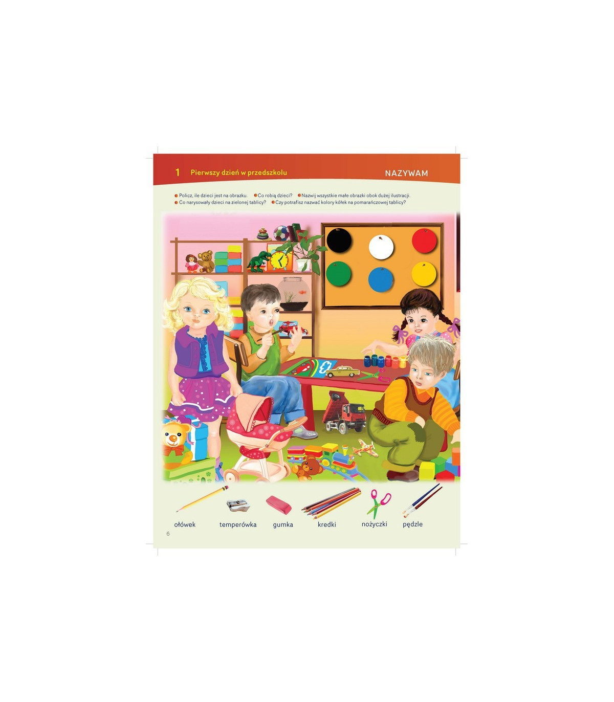 Pierwsza część zawiera tematy związane z najbliższym otoczeniem dziecka: przedszkole, dom rodzinny, zabawki, moje ciało, nazwy kolorów, owoców, warzyw, darów jesieni, zabaw zimowych i tradycji świątecznych. Ćwiczenia ogólnorozwojowe i manualne są zawsze związane z tematem lekcji, i mają określony stopień trudności. Każdy materiał słownikowy posiada ćwiczenia w słuchaniu i mówieniu. Treści pisane są rymem, przez co pomagają dziecku w przyswojeniu nie tylko wyrazów, ale całych zwrotów i zdań.