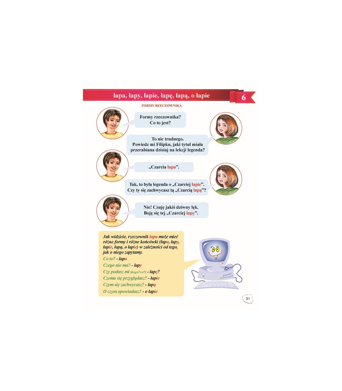 Część I - obejmuje powtórkę materiału z trzech lat nauki (głoska, litera, sylaba, wyraz, zdanie, rodzaje zdań) oraz wiadomości o podstawowych częściach mowy (rzeczownik , przymiotnik, czasownik).