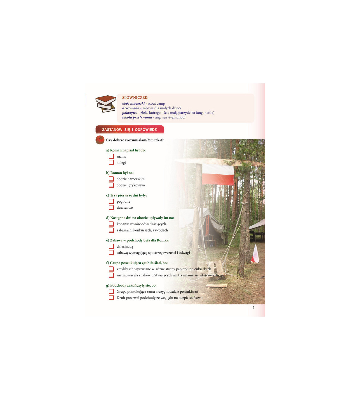 Podręcznik klasy V pozwala uczniom nieco szerzej spojrzeć na świat. W języku, w którym dziecko uczy się już piąty rok, teraz spotka się nie tylko z dziecięcą i młodzieżową literaturą polską, ale i literaturą światową oraz artykułami prasy młodzieżowej. Będąc więc na bieżąco z tym, co czyta jego rówieśnik w Polsce, odczuje zadowolenie i swoisty sukces.
