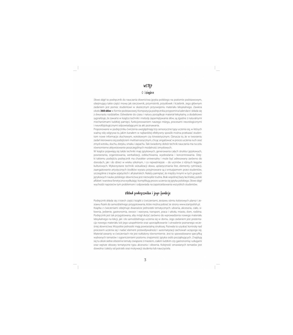 Proponowane są różnorodne techniki pracy: mapy myśli, generowanie całych struktur językowych, powtarzanie, organizowanie, werbalizowanie, odsłuchiwanie i kategoryzowanie. Dzięki takiemu podejściu podręcznik ma charakter uniwersalny i może być adresowany zarówno do dorosłych, jak i do dzieci w wieku szkolnym i co najważniejsze – do osób pochodzących z różnych kręgów kulturowych.