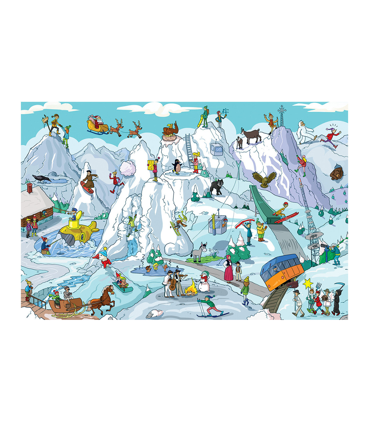 Wprawne oko rozpozna charakterystyczne miejsca, między innymi: Morskie Oko, Kasprowy Wierch czy Giewont, zilustrowane wesołymi scenkami.