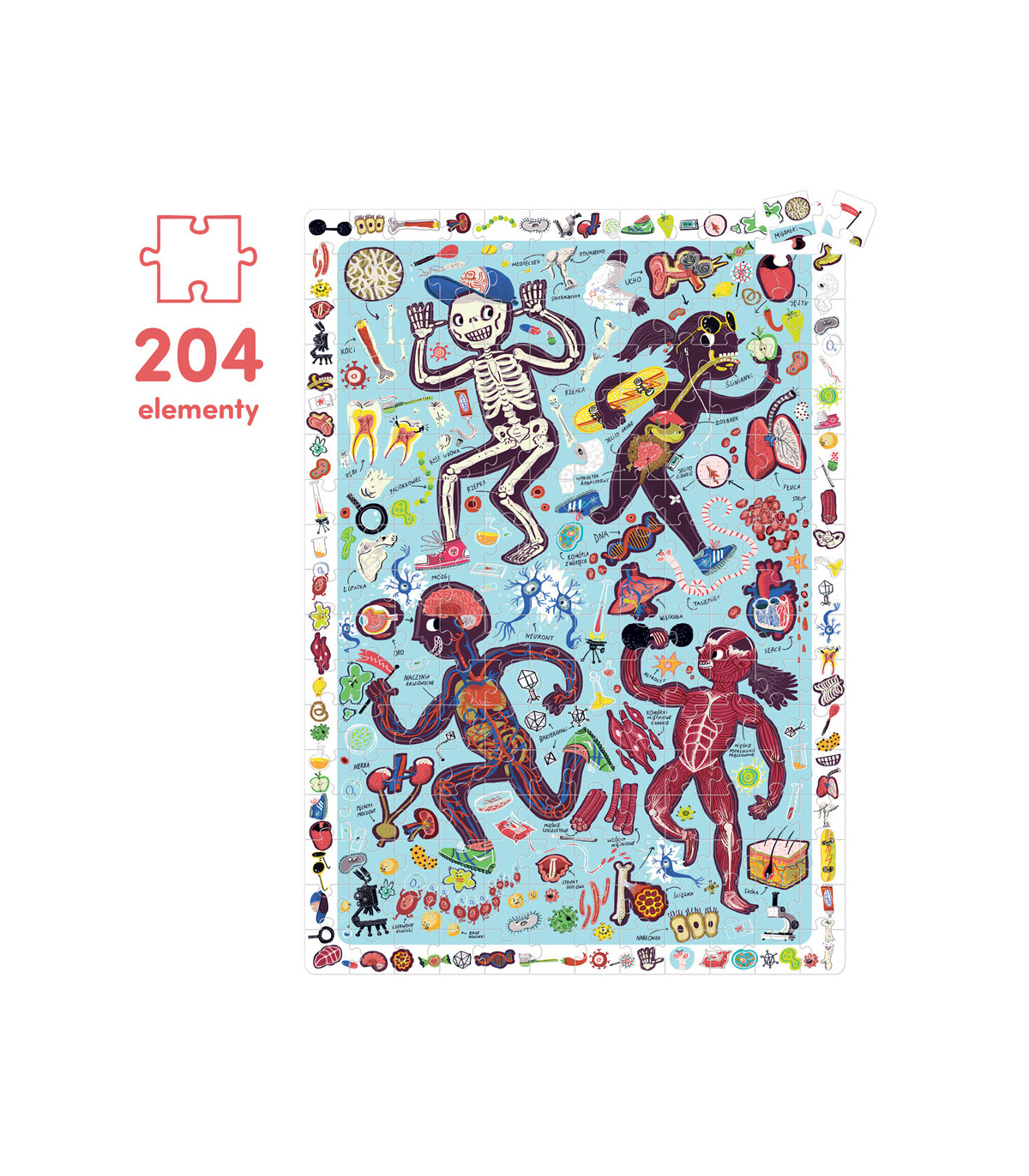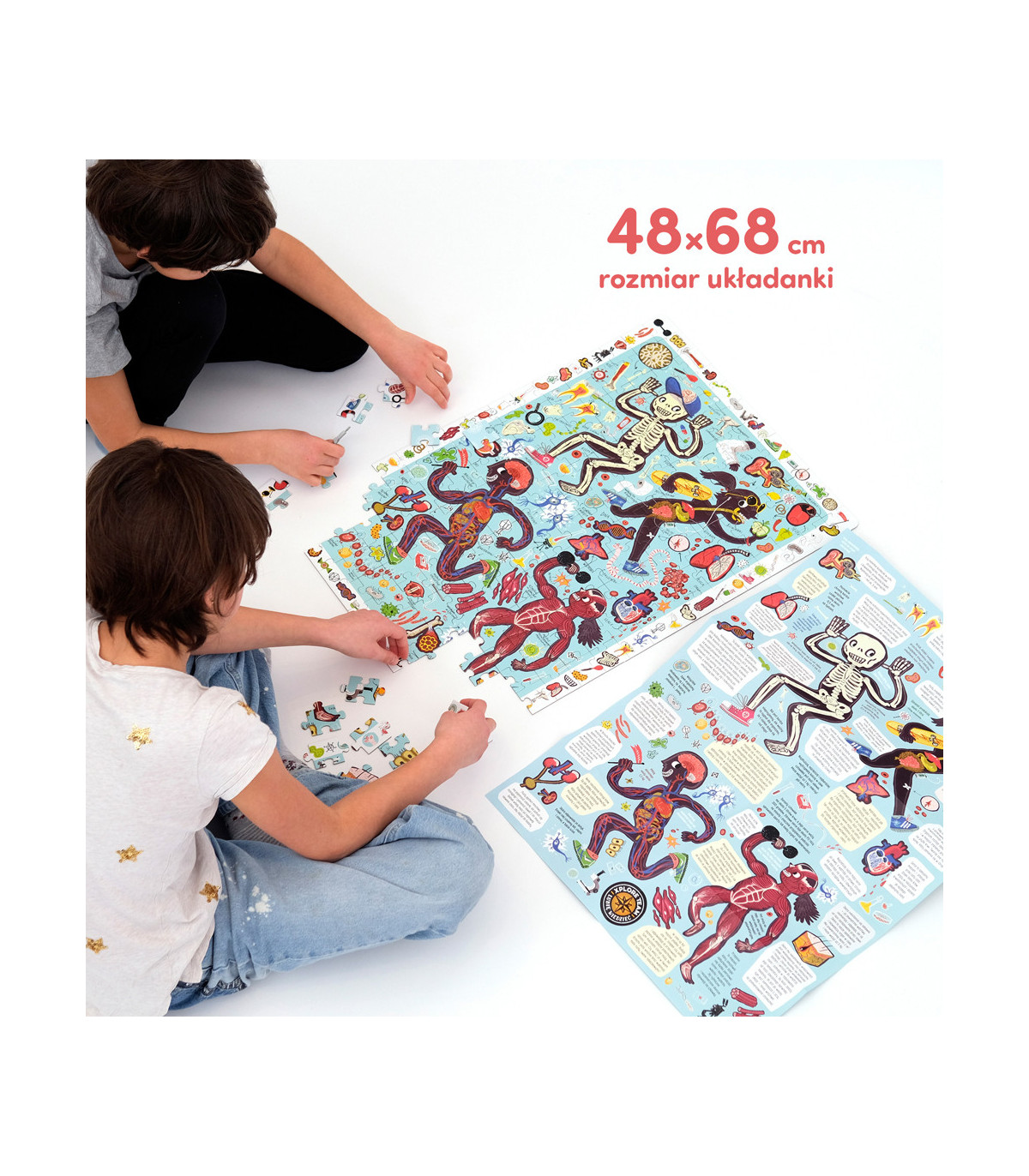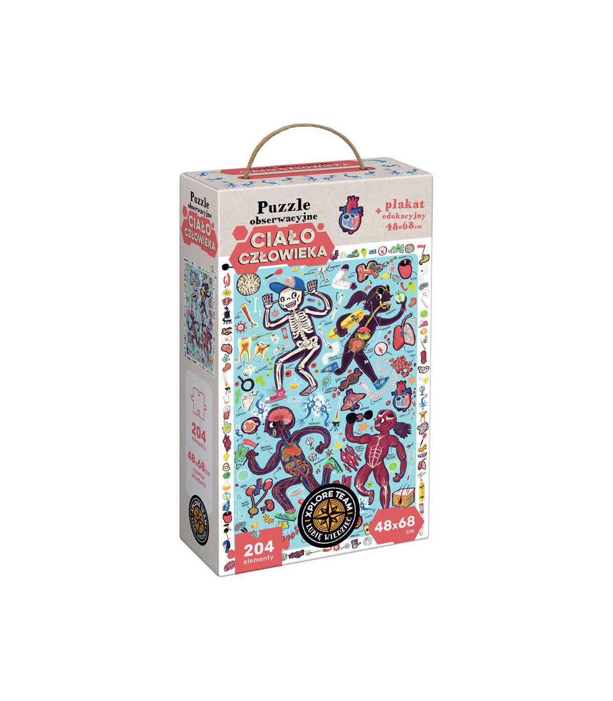 Xplorujcie świat po swojemu! Złóżcie układankę i zwróćcie uwagę, jak wyglądają i działają ludzkie organy, komórki i tkanki. Następnie, szukajcie detali z ramki i powtarzajcie nowe słownictwo. Na edukacyjnym plakacie znajdziecie mnóstwo anatomicznych ciekawostek, które pomogą zdobyć i utrwalić wiedzę. To świetna powtórka przed lekcjami biologii, ale też mnóstwo zabawy. Zaproście rodziców albo przyjaciół do wspólnej zabawy. Wiemy, czym jest radość odkrywania!