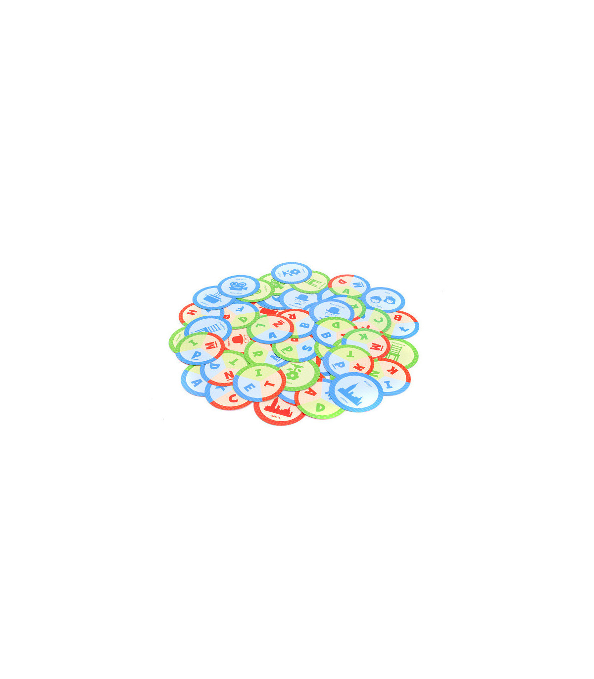 Każda z liter ma inny kolor. Jedna nich jest tego samego koloru co karta kategorii na wierzchu talii.
