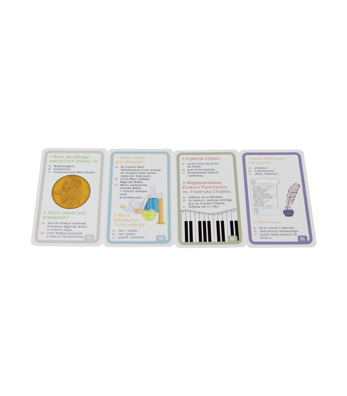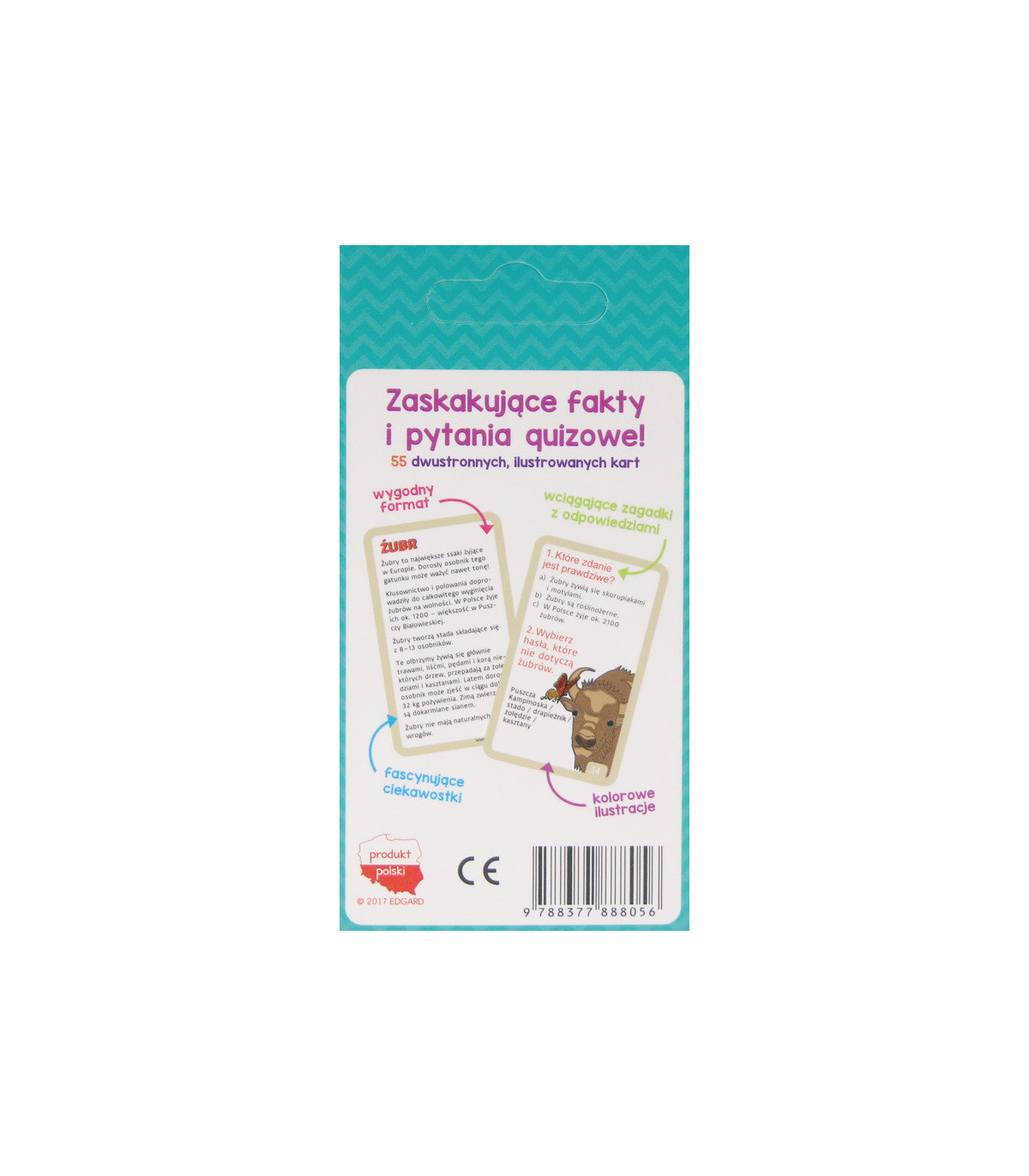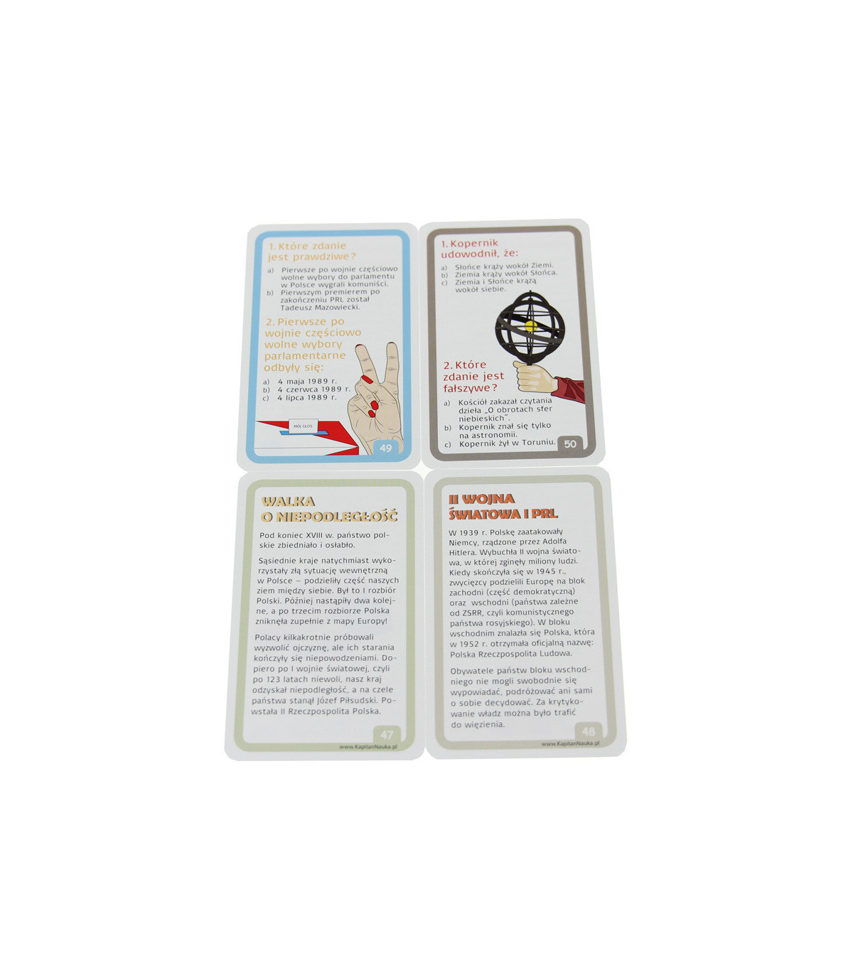 pogłębiająca wiedzę o Polsce. Fascynujące informacje o naszej historii, atrakcjach turystycznych, wybitnych rodakach oraz dodatkowo - ponad 100 pytań na kartach. Na jednej stronie każdej karty, znajdują się ciekawostki, natomiast na drugiej stronie umieszczono pytania, sprawdzające zdobytą wiedzę. Zadania można rozwiązywać samemu, bądź zaprosić do wspólnej zabawy rodzeństwo, rodziców lub koleżanki i kolegów. Bez względu na wiek graczy, każdy na pewno dowie się czegoś nowego.