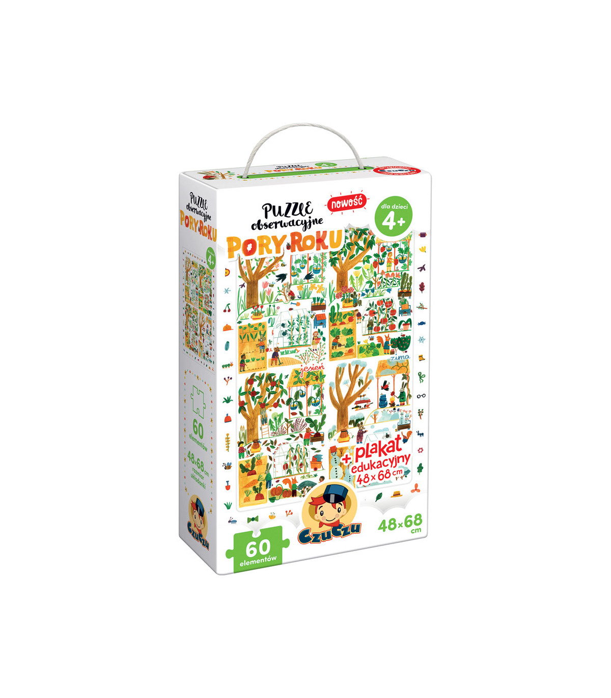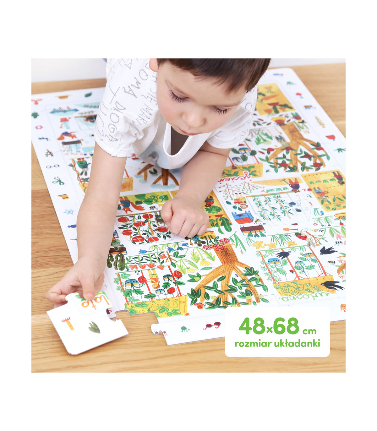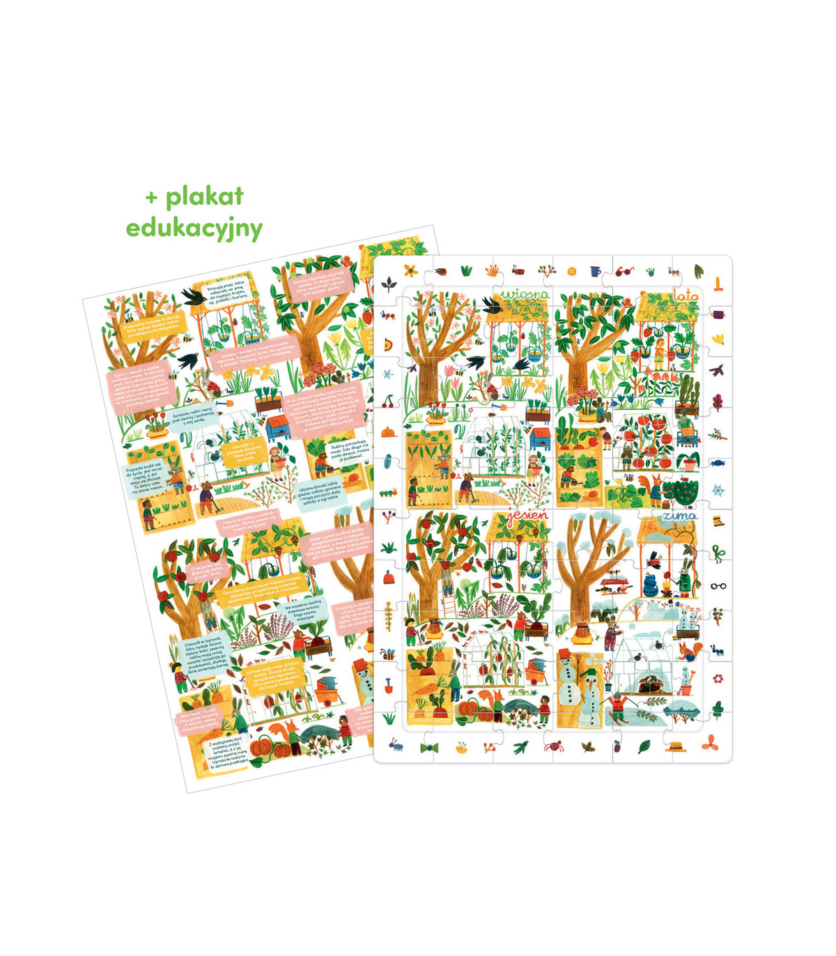 Przedszkolak ma wszechstronne zainteresowania i zadaje mnóstwo pytań. Pory roku i to, co dzieje się w ogrodzie to jeden z dobrze znanych mu tematów. Dlatego warto zaspokajać naturalną ciekawość świata. Ułóżcie puzzle! Następnie opiszcie ogród i prace w ciągu roku. Co rośnie na drzewach, a co w ziemi? Wyszukajcie detale z ramki i przeczytajcie ciekawostki z plakatu. Która spodobała się wam najbardziej? A może… sami posadzicie coś na grządce lub w doniczce? Zabawa z puzzlami zachęca do zdobywania i pogłębiania wiedzy na temat przyrody.