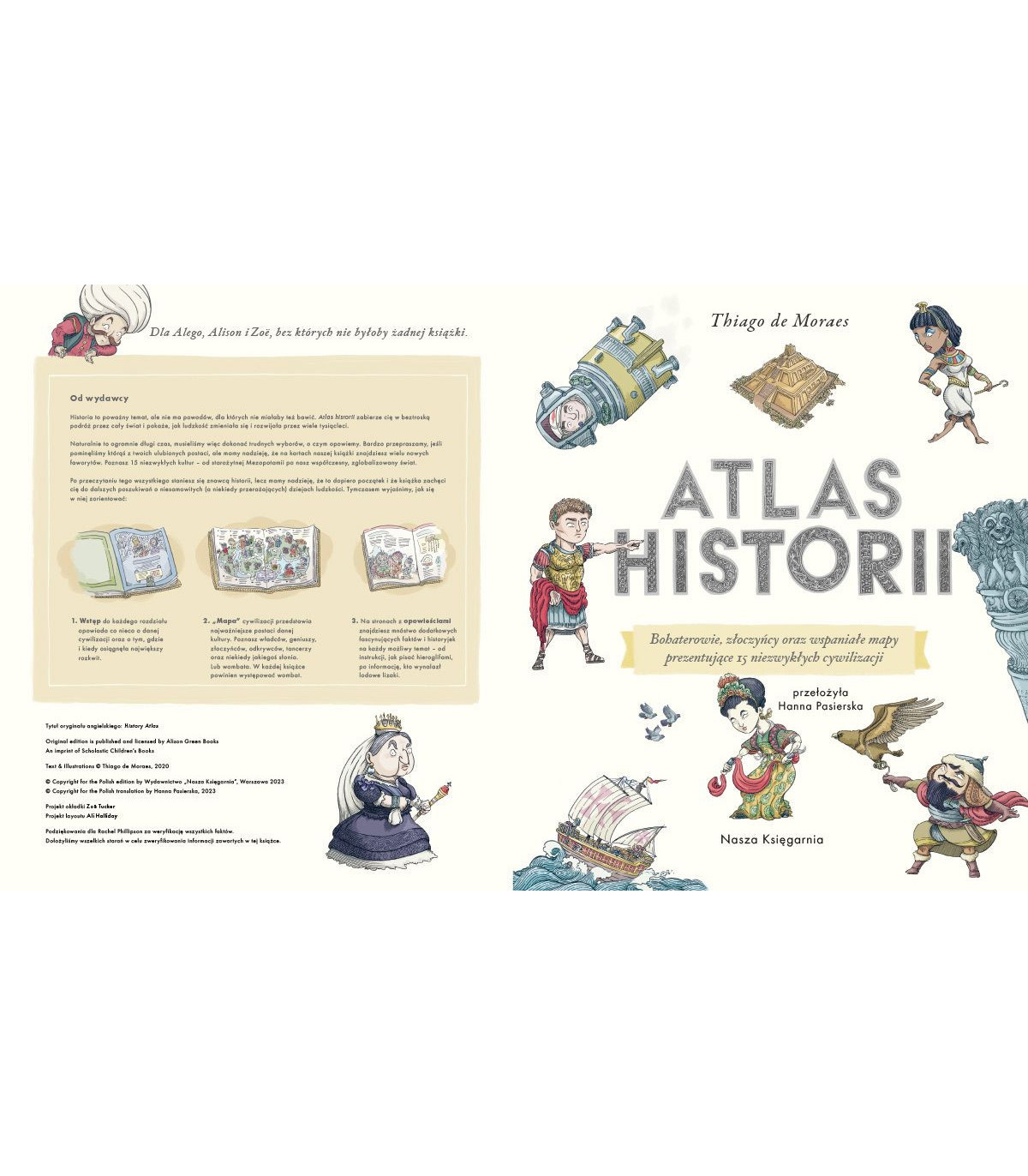 Thiago de Moraes w swoim wyjątkowym "Atlasie historii" zachęca do spojrzenia wstecz. Dzięki lekturze tej wspaniałej pozycji dowiesz się, w jaki sposób kształtowała się nasza rzeczywistość od czasów starożytnej Mezopotamii po współczesność. Poznasz dzieła i wynalazki różnych kultur, które ludzkość podziwia po dziś dzień. Atlas to nie tylko propozycja dla miłośników historii, ale i dla osób, które do tej pory były z nią trochę na bakier. Każdy, kto sięgnie po pozycję Thiago de Moraesa, przekona się, że powrót do przeszłości wcale nie musi być nudny. Kto wie, może dzięki lekturze tej książki zechcesz częściej zaglądać za zasłonę tego, co było?