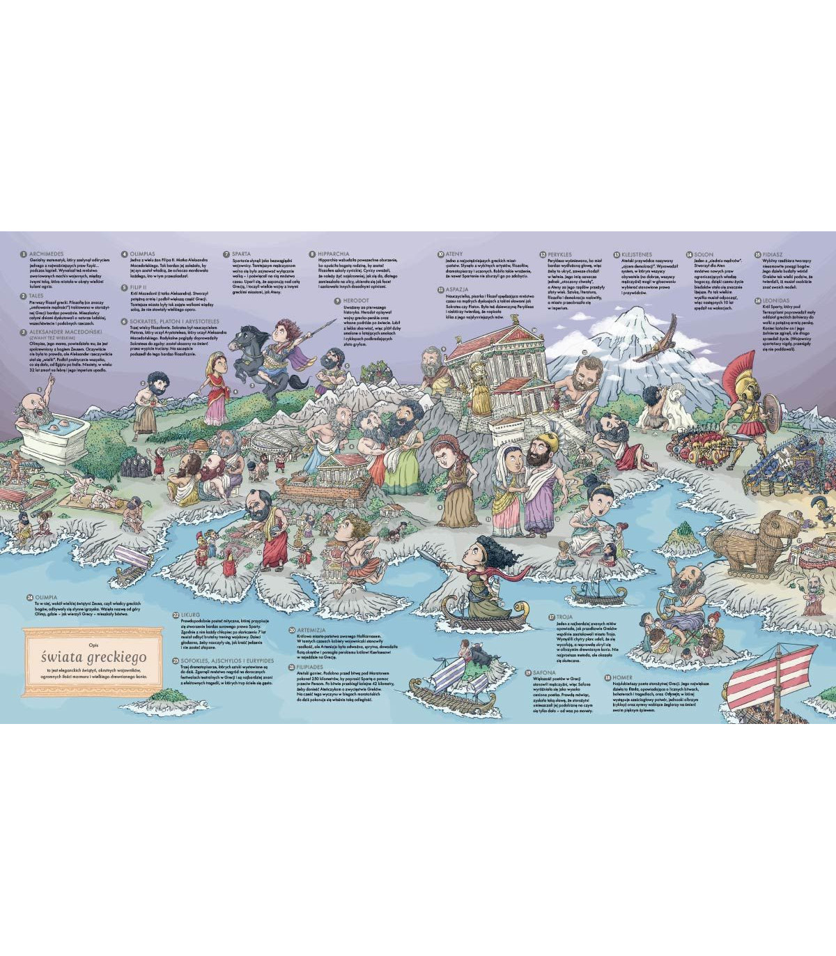 Książka opiera się na bogato ilustrowanych, dynamicznych mapach, które w przystępny sposób obrazują rozwój cywilizacji na przestrzeni wieków. Każda z piętnastu opisanych kultur została przedstawiona za pomocą szczegółowych grafik łączących fakty historyczne z humorem. Taki układ pozwala czytelnikowi na wizualne śledzenie zmian zachodzących w świecie oraz łatwe zapamiętywanie kluczowych procesów dziejowych. To idealna pozycja dla wzrokowców, którzy preferują naukę poprzez analizę detali na dużych, rozbudowanych planszach.