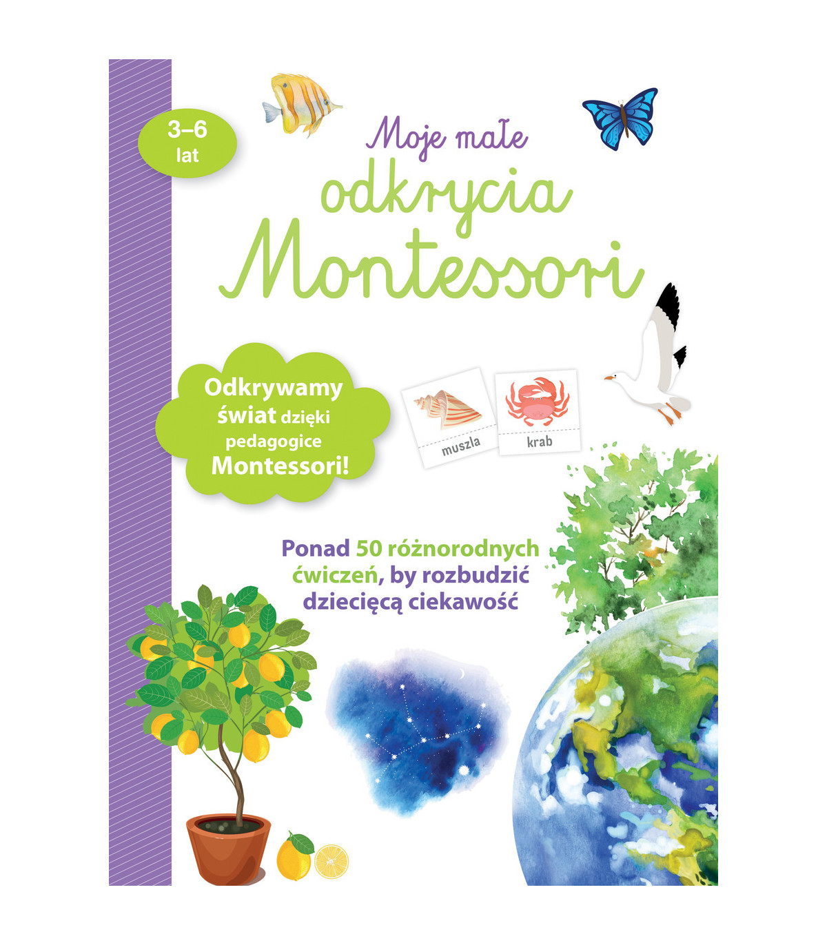 W książce znalazło się ponad 50 zróżnicowanych ćwiczeń, opracowanych zgodnie z założeniami pedagogiki Montessori, dzięki którym dziecko będzie mogło poszerzyć swoją wiedzę i przyswoić nowe słownictwo. Pozna różnorodne zjawiska przyrodnicze, pory roku, rośliny (drzewa, kwiaty, owoce...) i zwierzęta, poeksperymentuje z kolorami, z różnymi stanami wody i nie tylko. Zaangażuje się w zbieranie, sortowanie i klasyfikowanie, wykonując zielnik czy tworząc woreczki sensoryczne. Będzie rysować, malować, a także sadzić rośliny i obserwować ich rozwój. Bogaty zestaw materiałów do autokorekty pozwoli młodemu odkrywcy na samodzielne wykonywanie ćwiczeń i korygowanie swoich odpowiedzi.