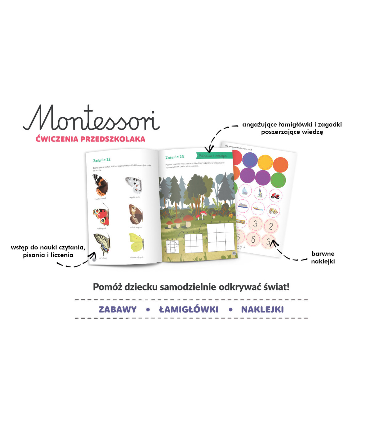 Montessori. Ćwiczenia przedszkolaka (4–6 lat) to bogato ilustrowana książka pełna zabaw i łamigłówek przygotowanych w duchu pedagogiki Montessori. Ćwiczenia dla przedszkolaków przybliżają wiedzę z kilku obszarów tematycznych, takich jak: świat roślin, świat zwierząt, kontynenty, czas i historia, tradycje i zwyczaje oraz kosmos.
