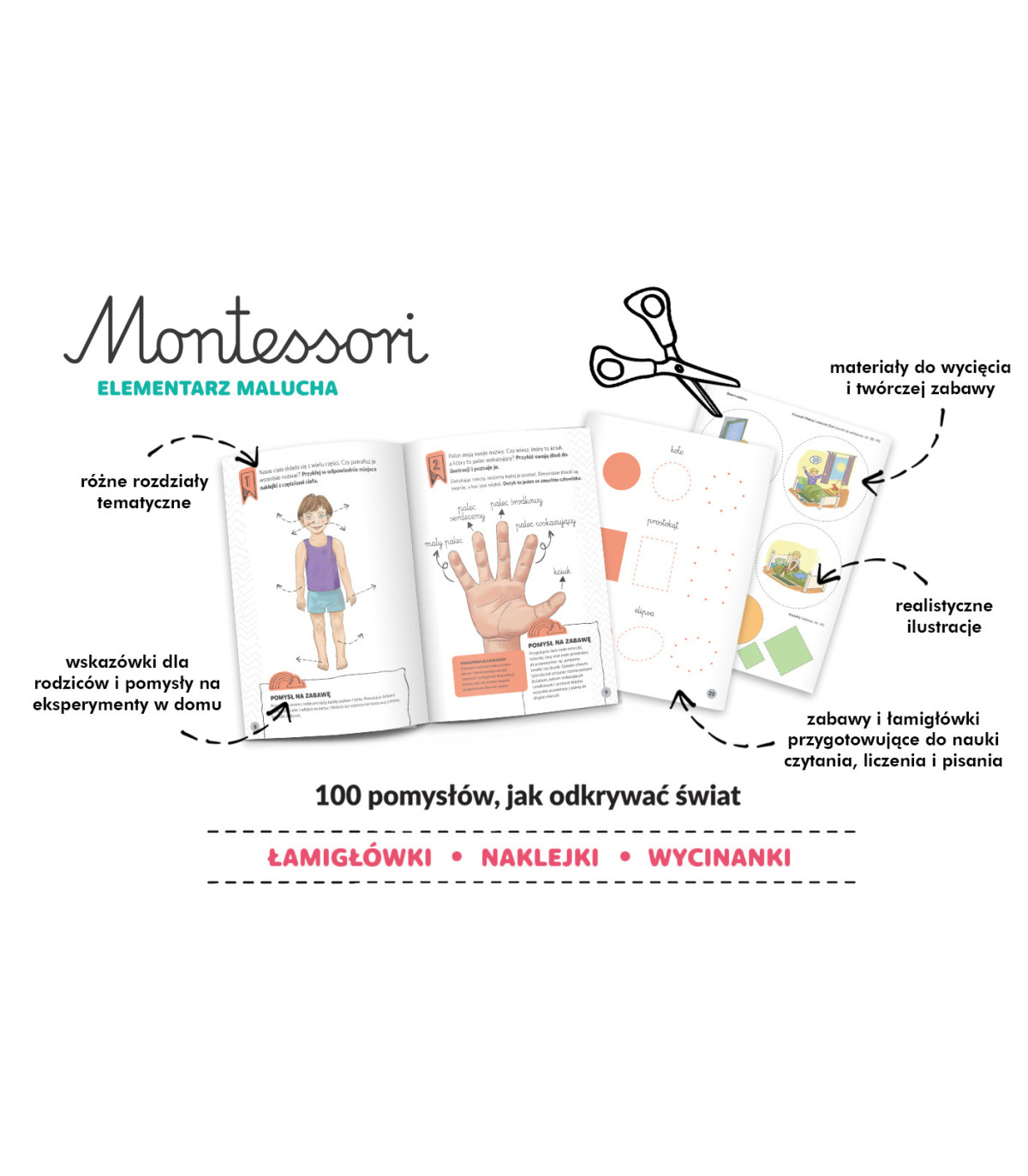 Bogato ilustrowane zadania i ciekawostki rozbudzają wrodzoną ciekawość świata u dziecka, a kreatywne materiały, takie jak naklejki, kolorowe plansze oraz materiały do wycięcia ułatwiają samodzielną naukę w najbardziej naturalny sposób, czyli poprzez doświadczenie i działanie. Dzięki połączeniu zagadek logicznych z różnorodnymi technikami plastyczno-sensorycznymi maluchy poznają metodę Montessori w praktyce, a przy tym rozwijają sprawność manualną, spostrzegawczość, koncentrację oraz wzbogacają słownictwo.