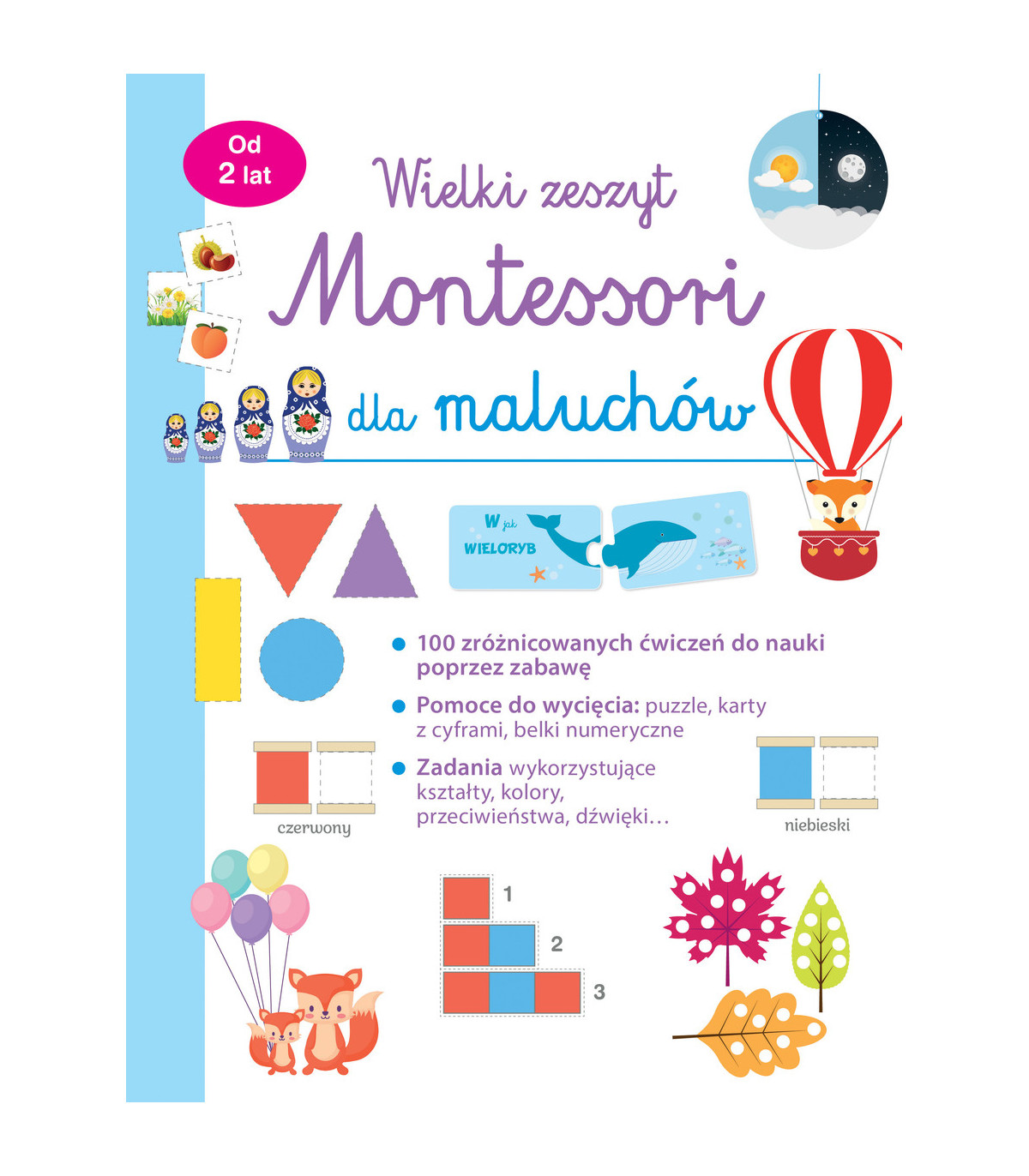 W książce znalazło się ponad 100 zróżnicowanych ćwiczeń do nauki poprzez zabawę, opracowanych zgodnie z zasadami pedagogiki Montessori. Najpierw maluch będzie rozwiązywał zadania związane z kolorami, kształtami, wielkością i przeciwieństwami, polegające na łączeniu w pary, sortowaniu i orientacji przestrzennej oraz gradacji. Skorzysta przy tym z mnóstwa elementów dołączonych w części z wycinankami. Następnie wyruszy na spotkanie z ilościami, symbolami i cyframi. Będzie miał do dyspozycji pomoce Montessori: karty z cyframi, belki numeryczne itd., które pomogą mu poczuć się pewniej podczas zdobywania wiedzy. Przy poznawaniu literek poprzez odpowiadające im dźwięki pomocne okażą się kolorowe układanki i obrazki do wycięcia. Liczne wskazówki przeznaczone dla rodziców stanowią idealne wsparcie podczas pracy z dzieckiem.