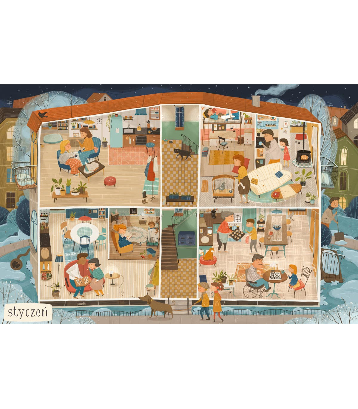 Co oni wszyscy robią w ciągu roku? Sprawdźcie sami, oglądając pełne szczegółów ilustracje! A co wy zwykle robicie w domu i na podwórku w styczniu, lutym, marcu i innych miesiącach?