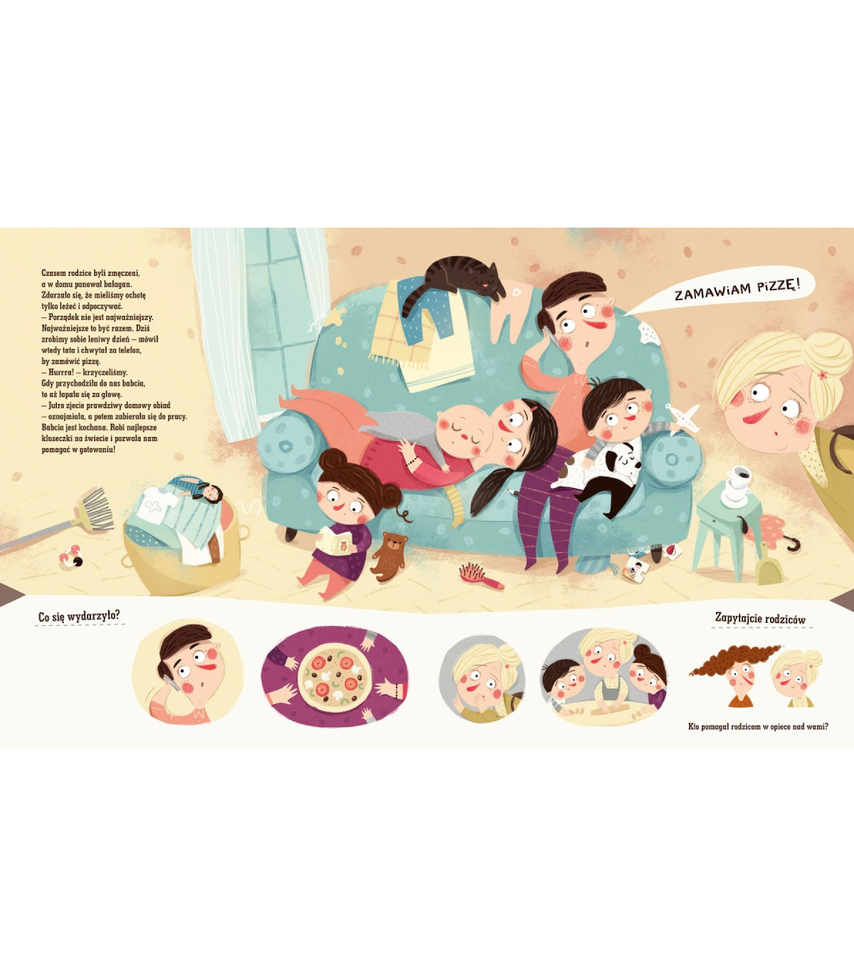 Pod każdą dużą ilustracją znajdują się dodatkowe obrazki mobilizujące do opisywania przeżyć bohaterów własnymi słowami, a także pytania skłaniające do rozmowy z rodzicem na temat szczególnie interesujący każdego malucha: własne przyjście na świat.