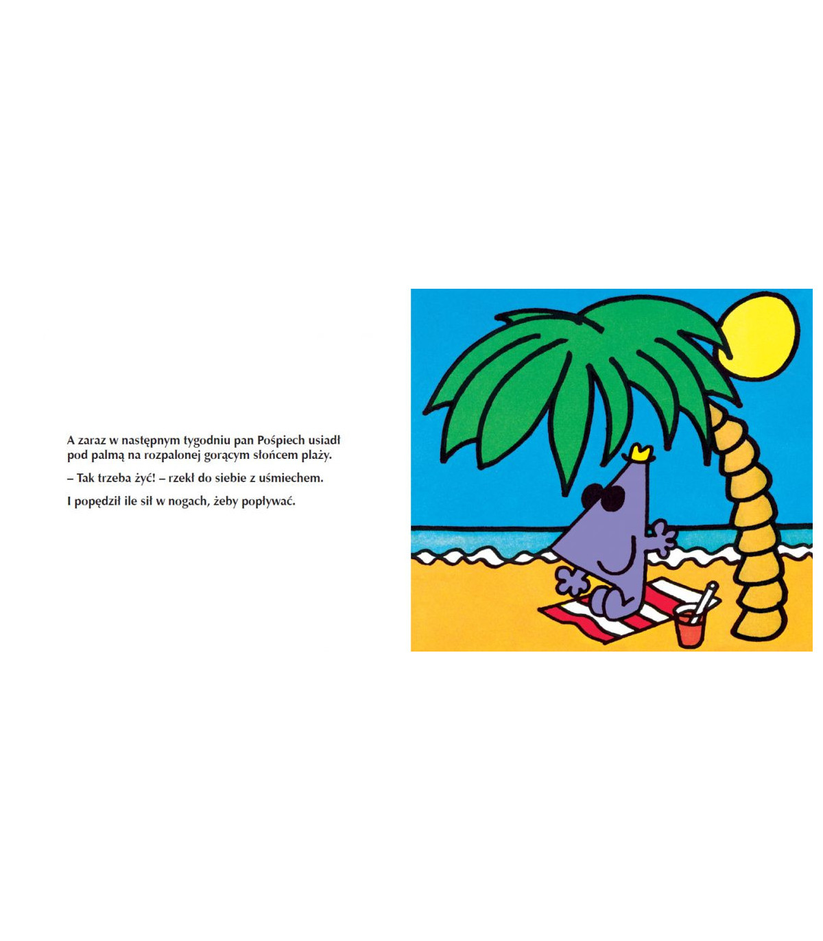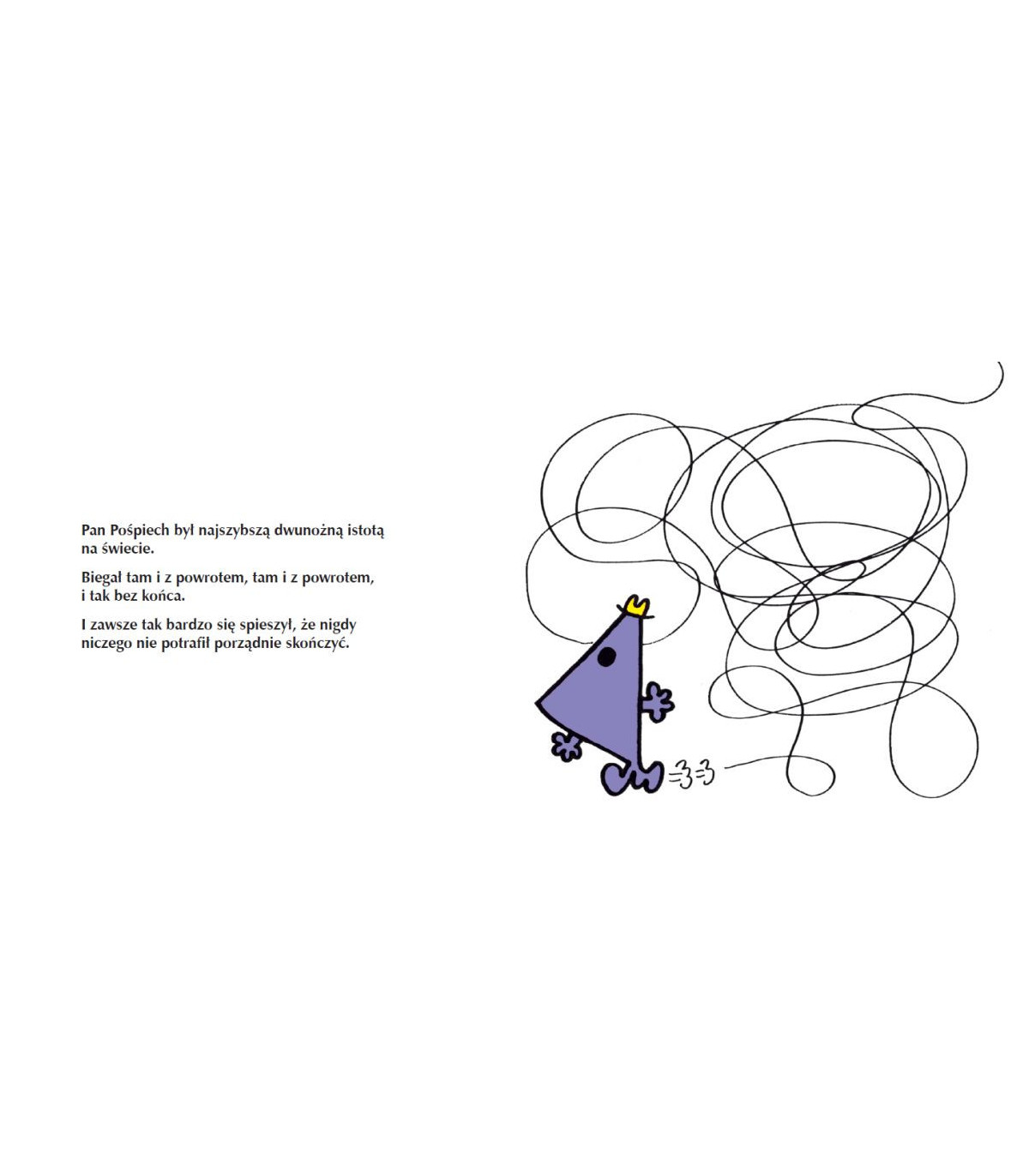 „Pan Pośpiech był najszybszą dwunożną istotą na świecie. Biegał tam i z powrotem, tam i z powrotem, i tak bez końca. I zawsze tak bardzo się spieszył, że nigdy niczego nie potrafił porządnie skończyć.”