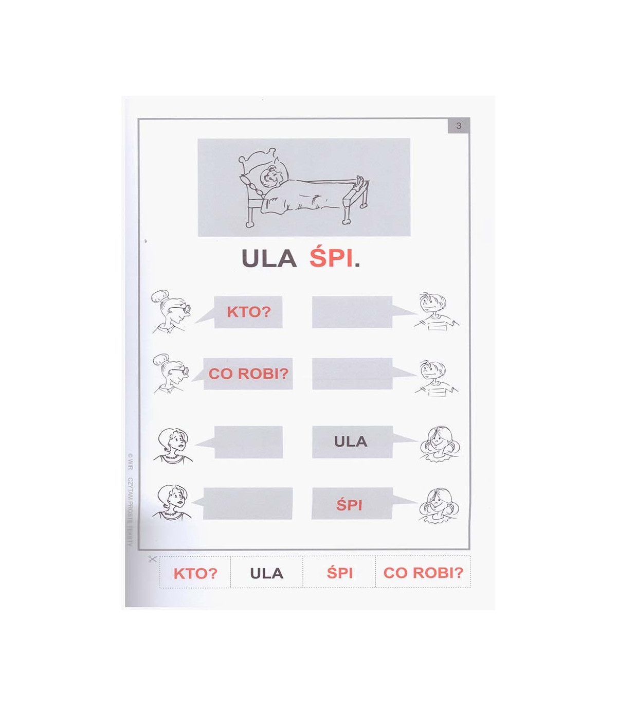 Zeszyt zawiera ćwiczenia czytania ze zrozumieniem na poziomie podstawowym od prostych zdań pojedynczych do pierwszych krótkich tekstów. Zdania w większości zbudowane są z sylab otwartych oraz podstawowych rzeczowników i czasowników. Ćwiczenia mają na celu naukę rozumienia przeczytanego tekstu.