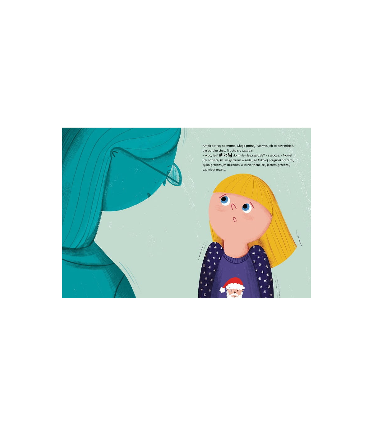 – A co, jeśli Mikołaj do mnie nie przyjdzie? – szepcze Antek. – Usłyszałem w radiu, że Mikołaj przynosi prezenty tylko grzecznym dzieciom. A ja nie wiem, czy jestem grzeczny czy niegrzeczny…