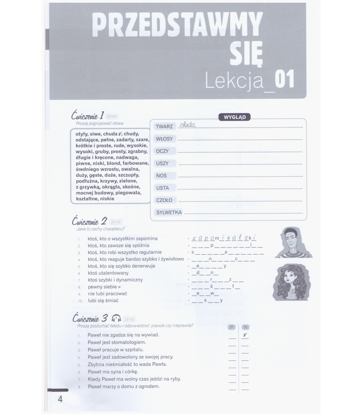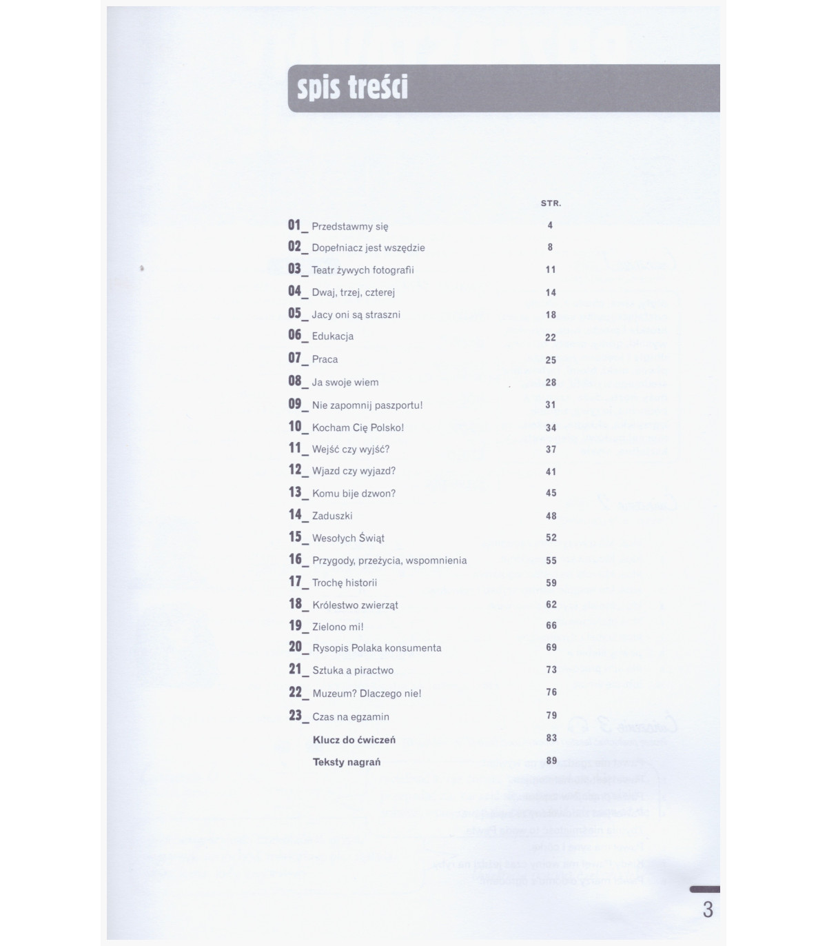 Bogaty zestaw starannie wyselekcjonowanych ćwiczeń, które doskonale uzupełniają treści wprowadzane w podręczniku. Urozmaicona forma zadań i funkcjonalna grafika dopełniająca ich treści sprawią, że nikt nie będzie się nudził z tą książką. Wiele ćwiczeń bazuje na dialogach i rozbudowanych tekstach: legendach, opisach świąt i tradycji, wywiadach, sondach ulicznych, wypowiedziach różnych osób na tematy dotyczące różnorodnych problemów dzisiejszego świata. Wszystkie teksty również w wersji audio - na dołączonej do książki płycie znajduje się 127 nagrań! Pracując z tak różnorodnym materiałem, łatwo zapomnieć, że to zbiór zadań mających na celu utrwalenie bądź poszerzenie zasobu słownictwa, automatyzację konstrukcji gramatycznych i przede wszystkim udoskonalenie poziomu znajomości polskiego, poprzez rozwijanie wszystkich kompetencji językowych.
