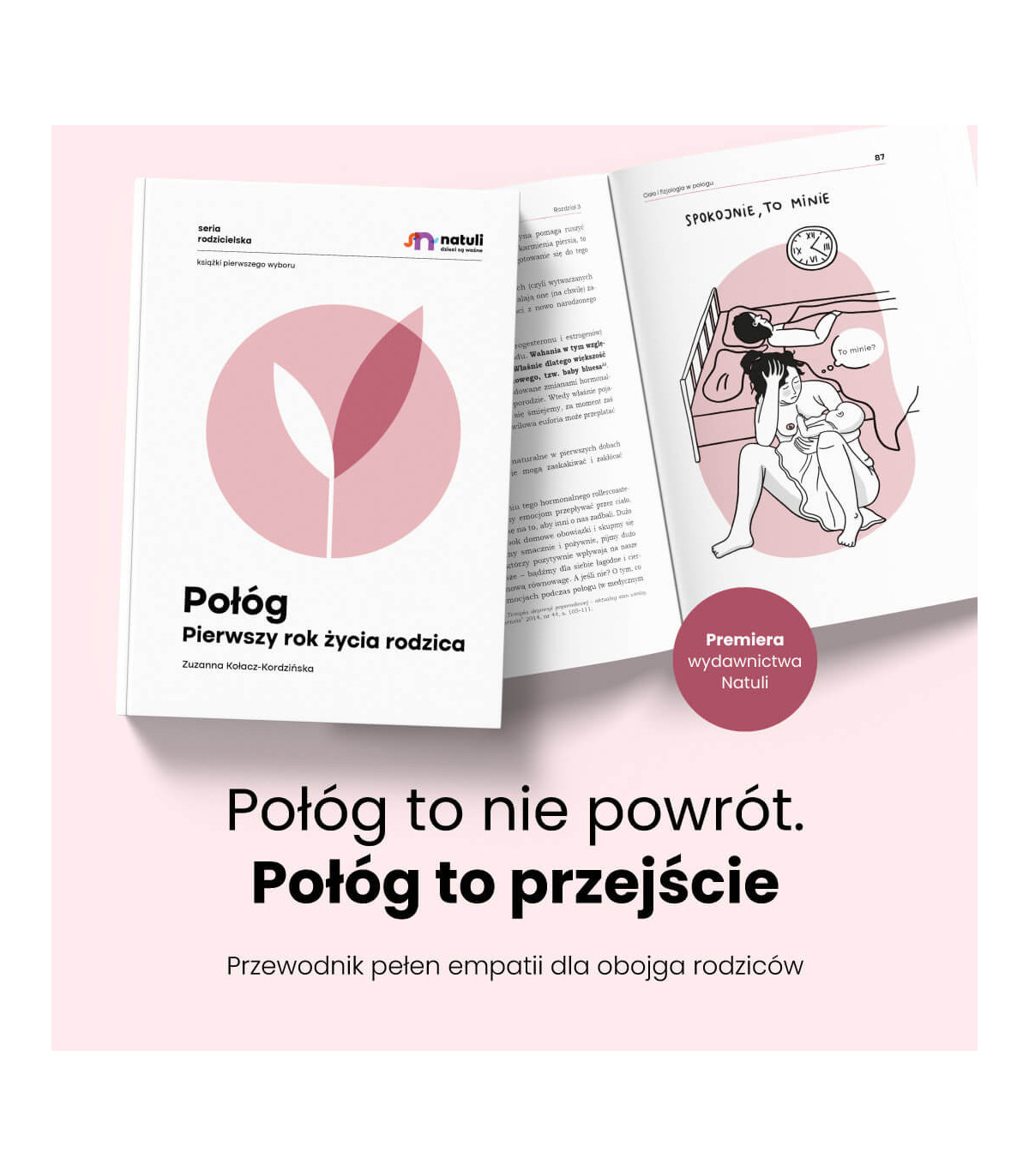 Połóg to wielka transformacja w życiu młodej matki – tożsamościowa i emocjonalna – tworząca podwaliny pod relację z dzieckiem. Autorka z dużą empatią i znawstwem tematu pisze o zmieniającym się ciele i jego fizjologii oraz towarzyszącym temu procesowi emocjom. Zajmuje się odżywianiem, przygląda się seksualności i powrotowi do płodności, omawia trudności fizjologiczne. Dużo miejsca poświęca współrodzicowi, a także rodzinie i najbliższym, pomagając im odnaleźć się w nowej rodzinnej sytuacji. Podpowiada, jak radzić sobie w późniejszych miesiącach i jak przygotować się na powrót na rynek pracy. Rozprawia się z mitami dotyczącymi macierzyństwa, a wszystko to, by wesprzeć kobietę w trosce o swój dobrostan. W ten sposób – pełen ciepła i troski – prowadzi przez połóg, który staje się nie tylko czasem do przetrwania, a przełomowym momentem w życiu rodziny i ważnym dopełnieniem okołoporodowej triady. Wydobywając go z cienia, pozwala docenić jego wyjątkowo więziotwórczą moc.