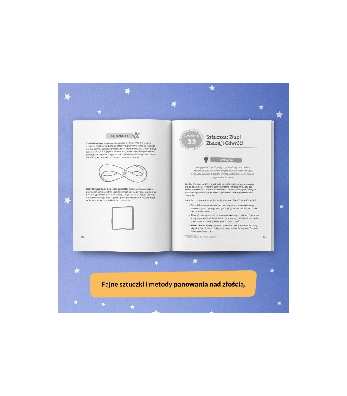 Książka-narzędzie, które może być stosowane zarówno w domu z rodzicem, jak i w gabinecie psychologa. Złość rzadko rodzi się w próżni, najczęściej odczuwamy tę emocję w kontekście relacji międzyludzkich. Często jest przykrywką dla wielu innych emocji, które w sobie nosimy. Opierając się na powyższych założeniach, książka przedstawia 35 aktywacji inspirowanych terapią dialektyczno-behawioralną. Niewiele teorii, dużo ćwiczeń, gra psychoedukacyjna i autorskie metody pracy psychologicznej inspirowane DBT, np. rozbrajanie bomby złości inspirowane analizą łańcuchową czy Domek Złości. DBT jest certyfikowaną metodą terapeutyczną o kliniczne udowodnionej skuteczności. Ćwiczenia mogą być też wykorzystywane w ramach elementarnej pracy psychologicznej.
