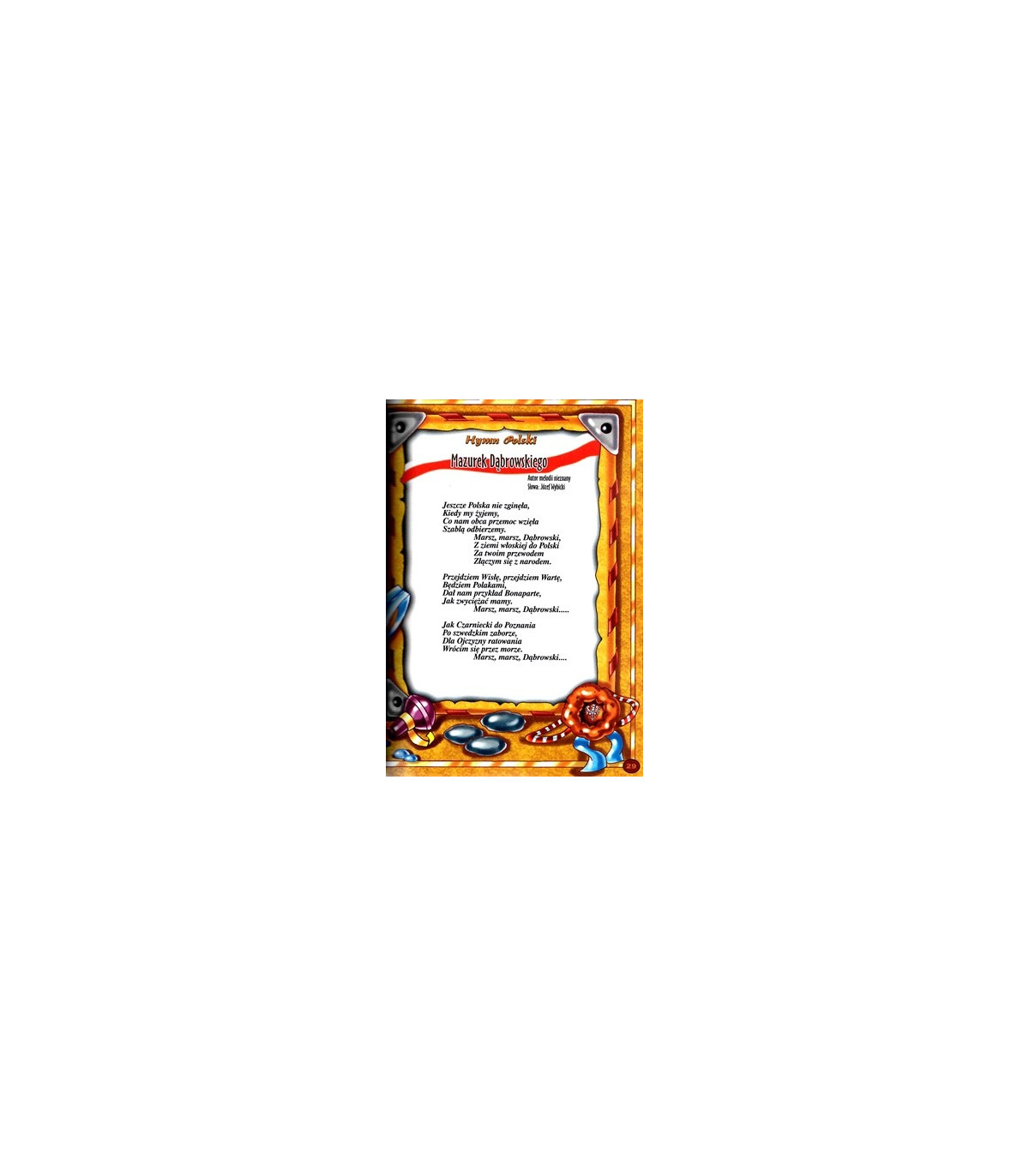 Ponadto nasz mały czytelnik dowiaduje się jaka była geneza powstania Mazurka Dąbrowskiego oraz ma możliwość prześledzenia tekstu hymnu narodowego.