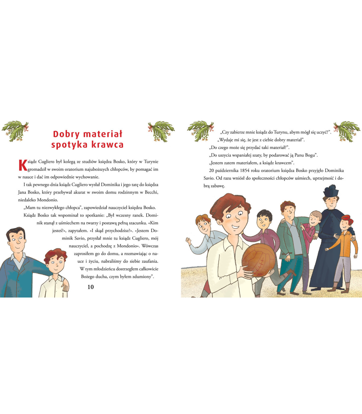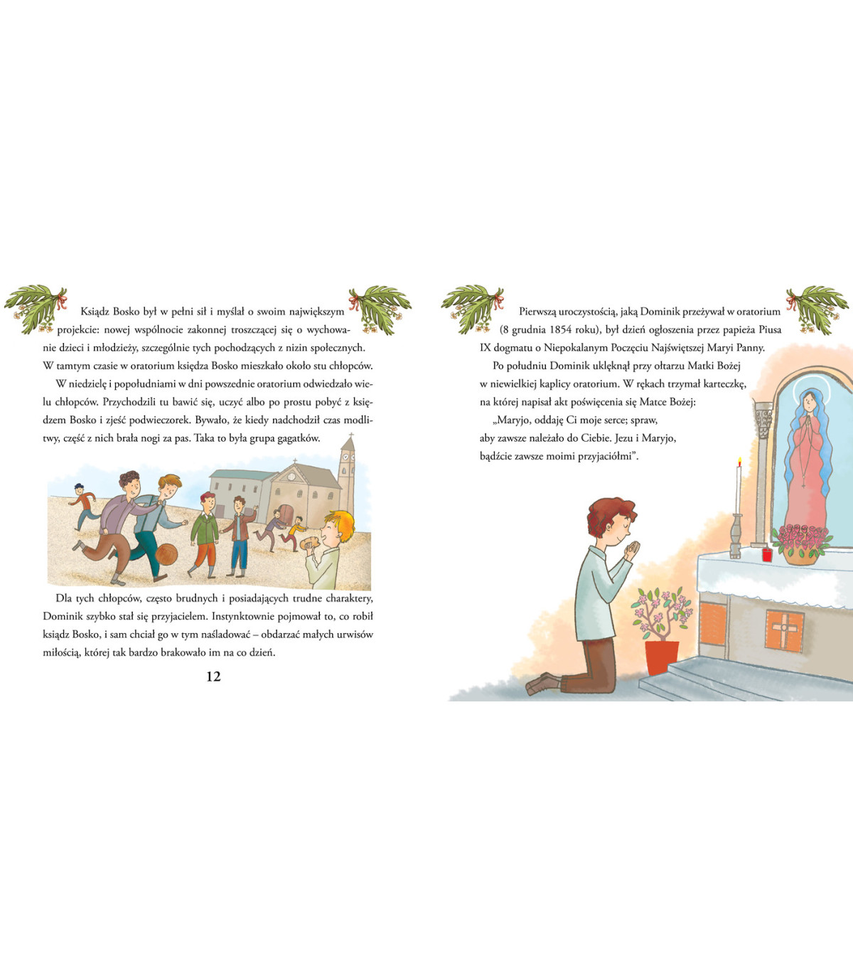 W tym tomiku mali czytelnicy poznają Świętego Dominika Savio – młodego chłopca, którego wyróżniało pragnienie świętości i życia dla nieba. Wychowanek Świętego Jana Bosko z radością pomagał swoim kolegom, marząc, aby Jezus i Maryja byli jego przyjaciółmi, a każdy człowiek bratem.