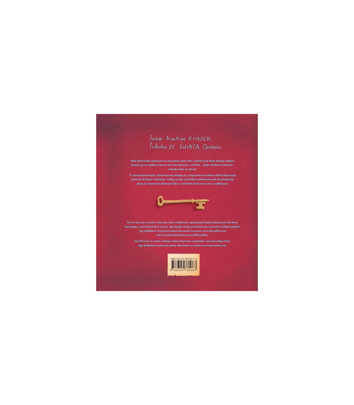 Zaprasza go na wspólną wyprawę do świata opowieści, w którym – dzięki odrobinie wyobraźni – wszystko może się zdarzyć. Jestem dzieckiem książek została stworzona przez uznanych na całym świecie artystów Olivera Jeffersa i Sama Winstona. Zawiera unikalne ilustracje składające się z tekstów książek.