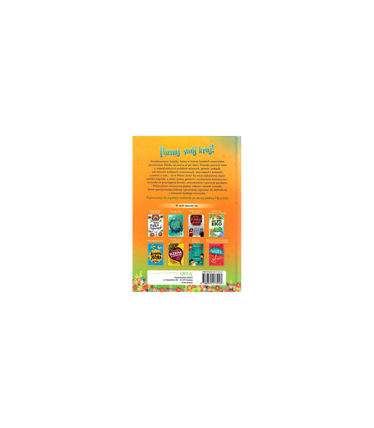 Poznaję Polskę to najlepsza książka dla dzieci, które chcą dowiedzieć się czegoś ciekawego o swojej Ojczyźnie. Zawiera zbiór krótkich, łatwych w odbiorze wierszyków opisujących najciekawsze miejsca w znanych polskich miastach, polskie rzeki, góry, zwierzęta, rośliny, a także zwyczaje, święta, a nawet potrawy.